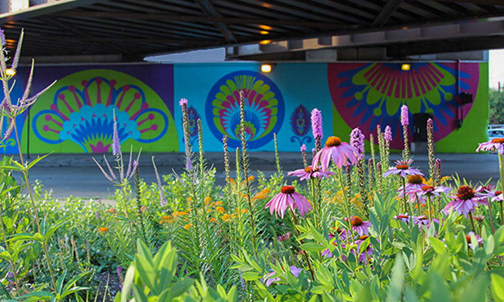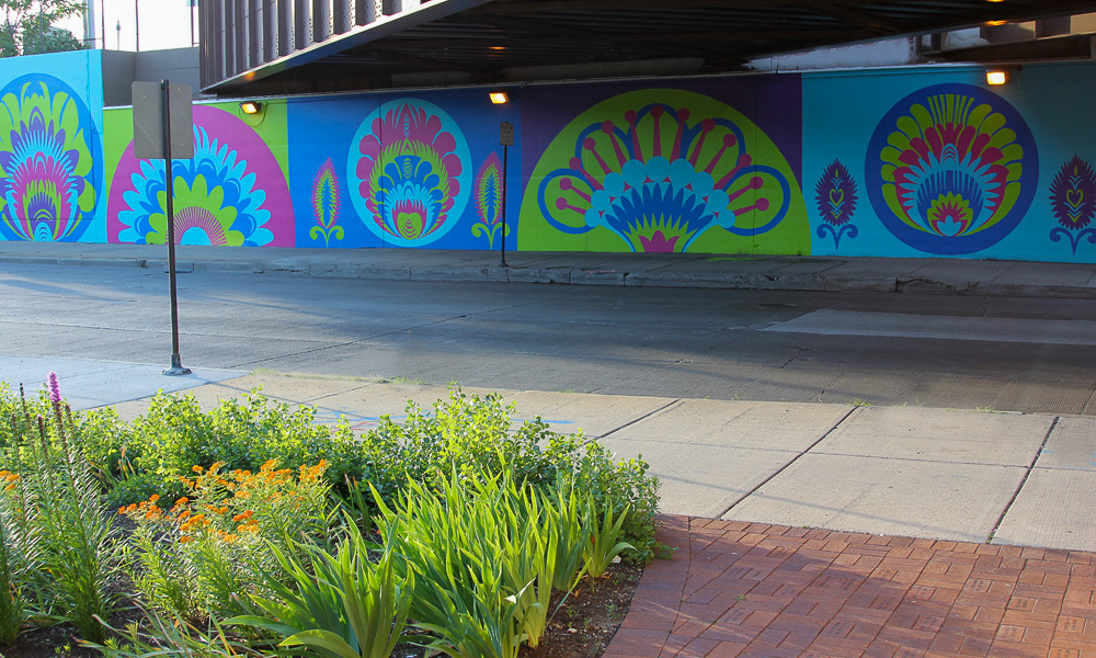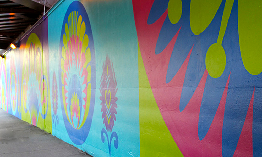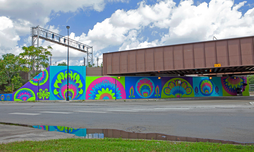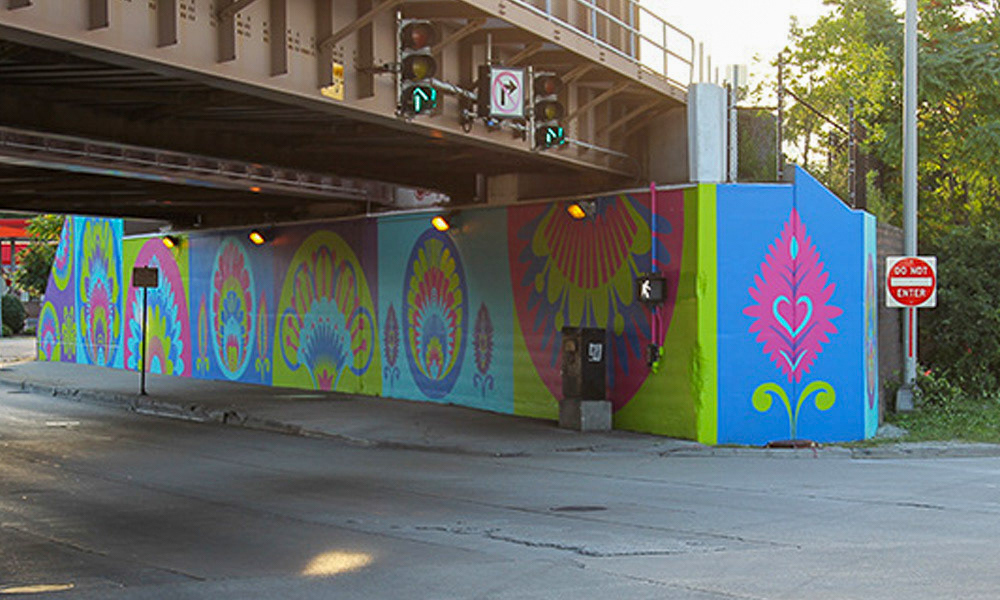 Media: Acrylic on Mason Wall Size: 16 ft x 180 ft (4.3 m x 54.8 m) The CrossCuts Mural is located in Chicago on Addison Avenue between the Kennedy Expressway exit ramp and Avondale Avenue.
