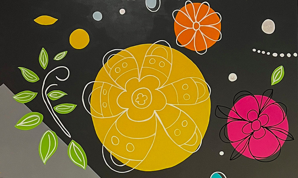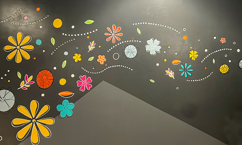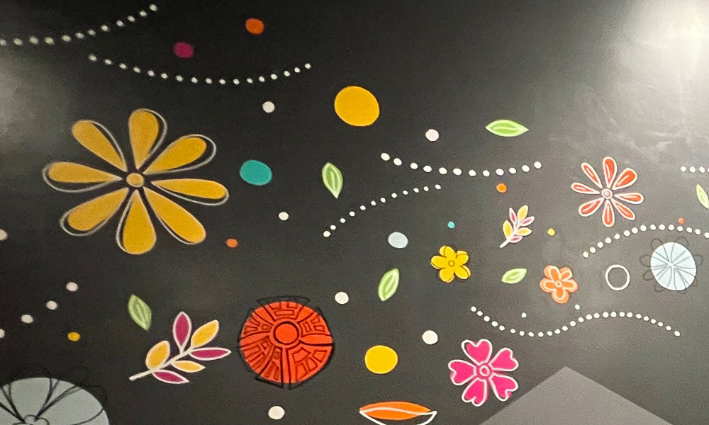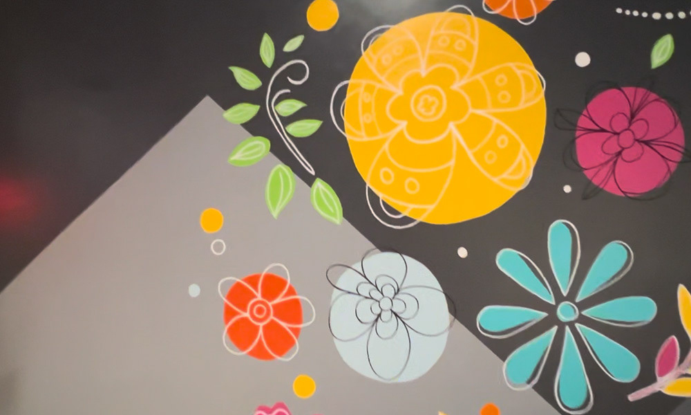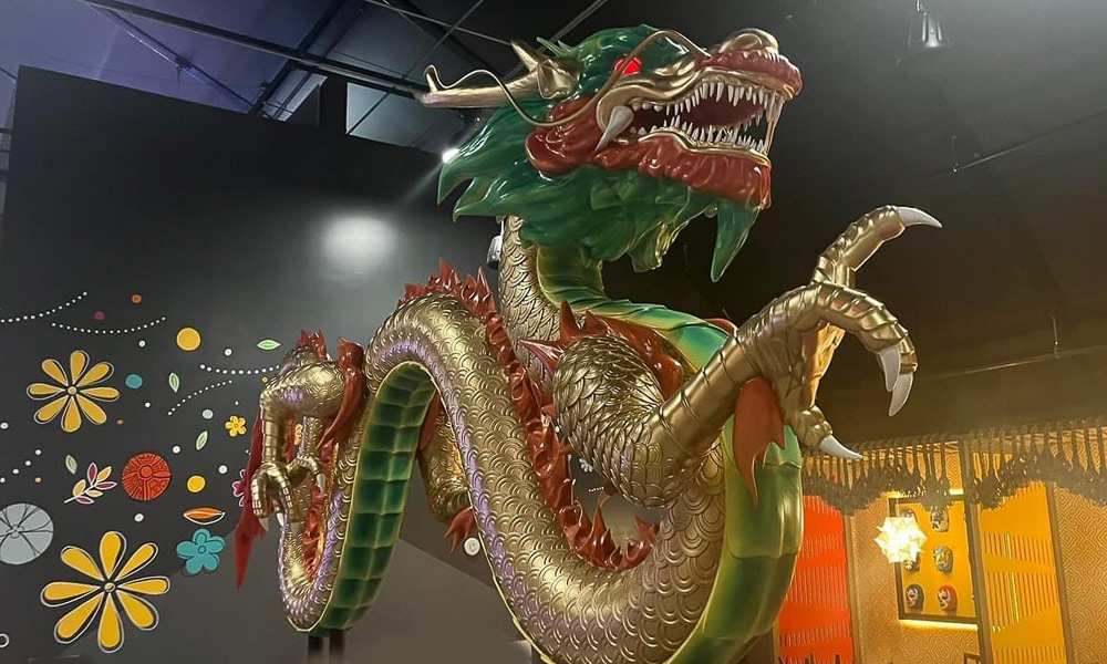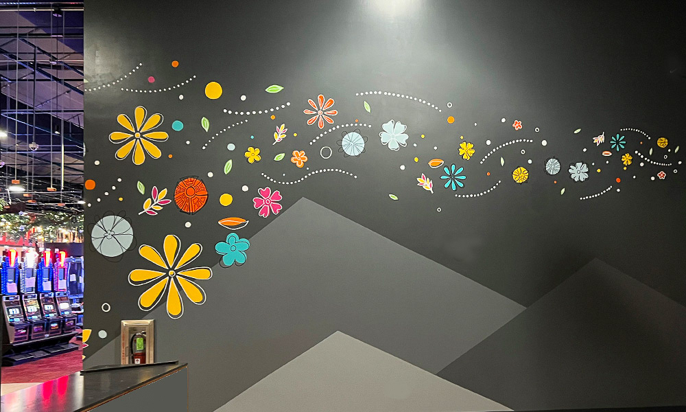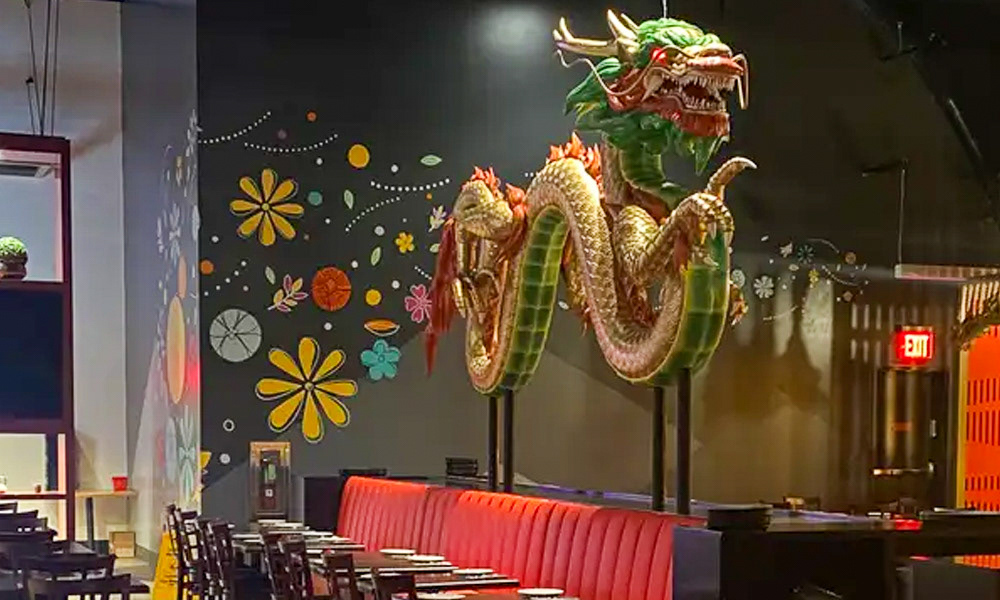 Dragon Flower Mural Media: Acrylic on on Plaster Size: 17 ft x 48 ft 8 in (5.1 m x 14.8 m) The Dragon Flower Mural is located in the Aztec Asia Restaurant in the American Place Casino in Waukegan, IL.