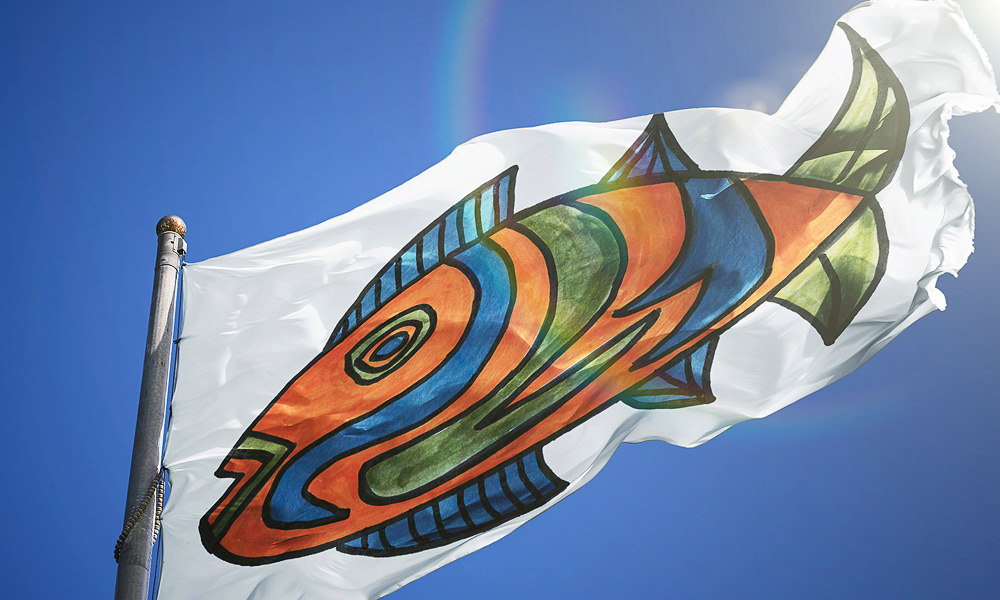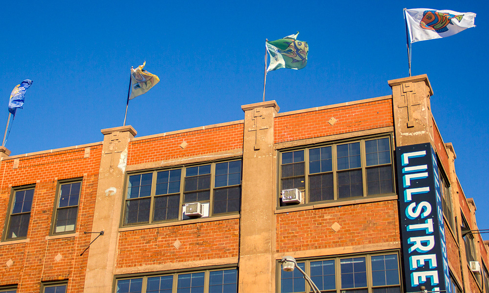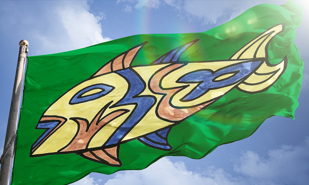 Media: Acrylic on Canvas Size: 4 ft high X 8 ft wide (1.21 m x 2.43 m) The Flying Fish Flags lnstallation is located at the Lill Street Building in Chicago, IL.