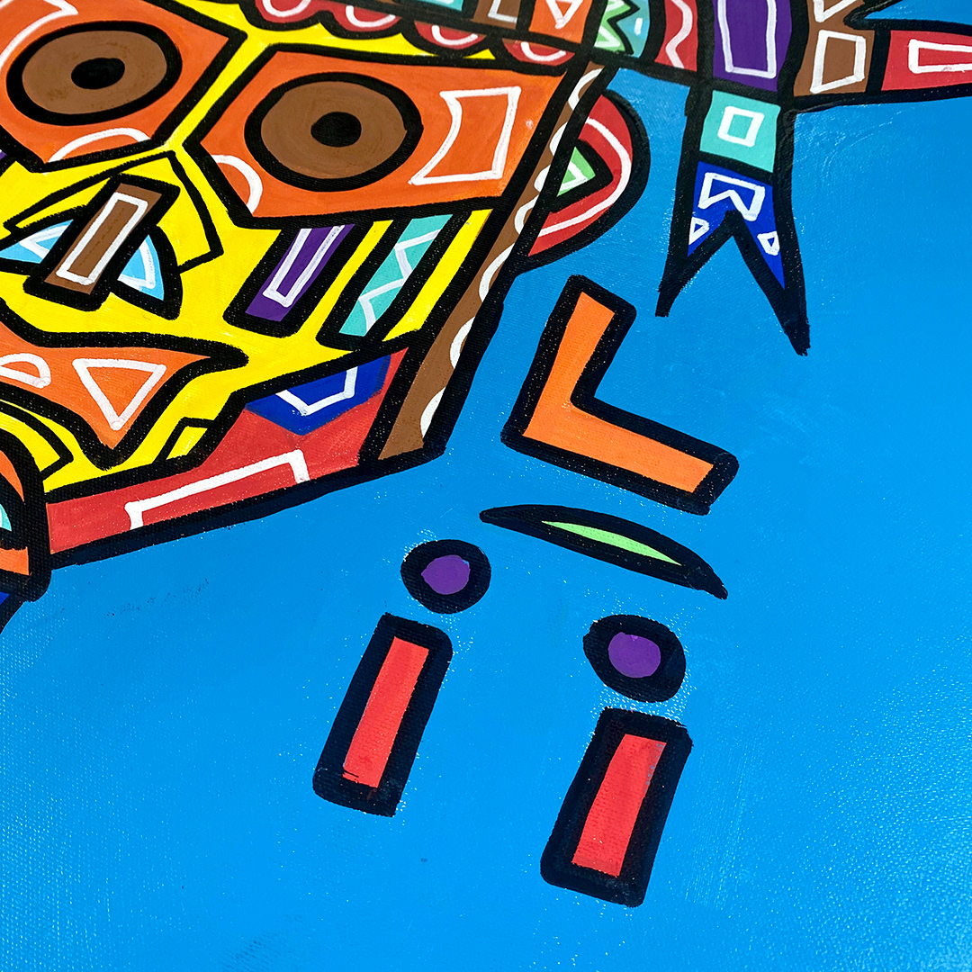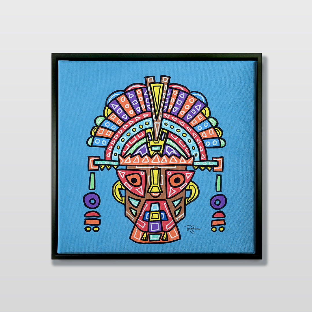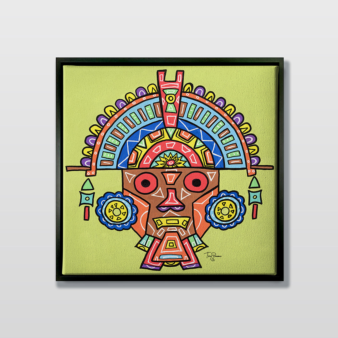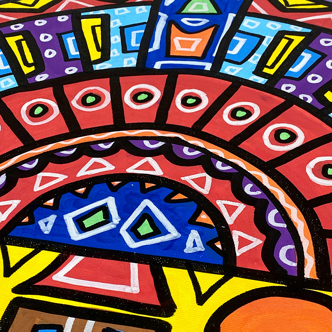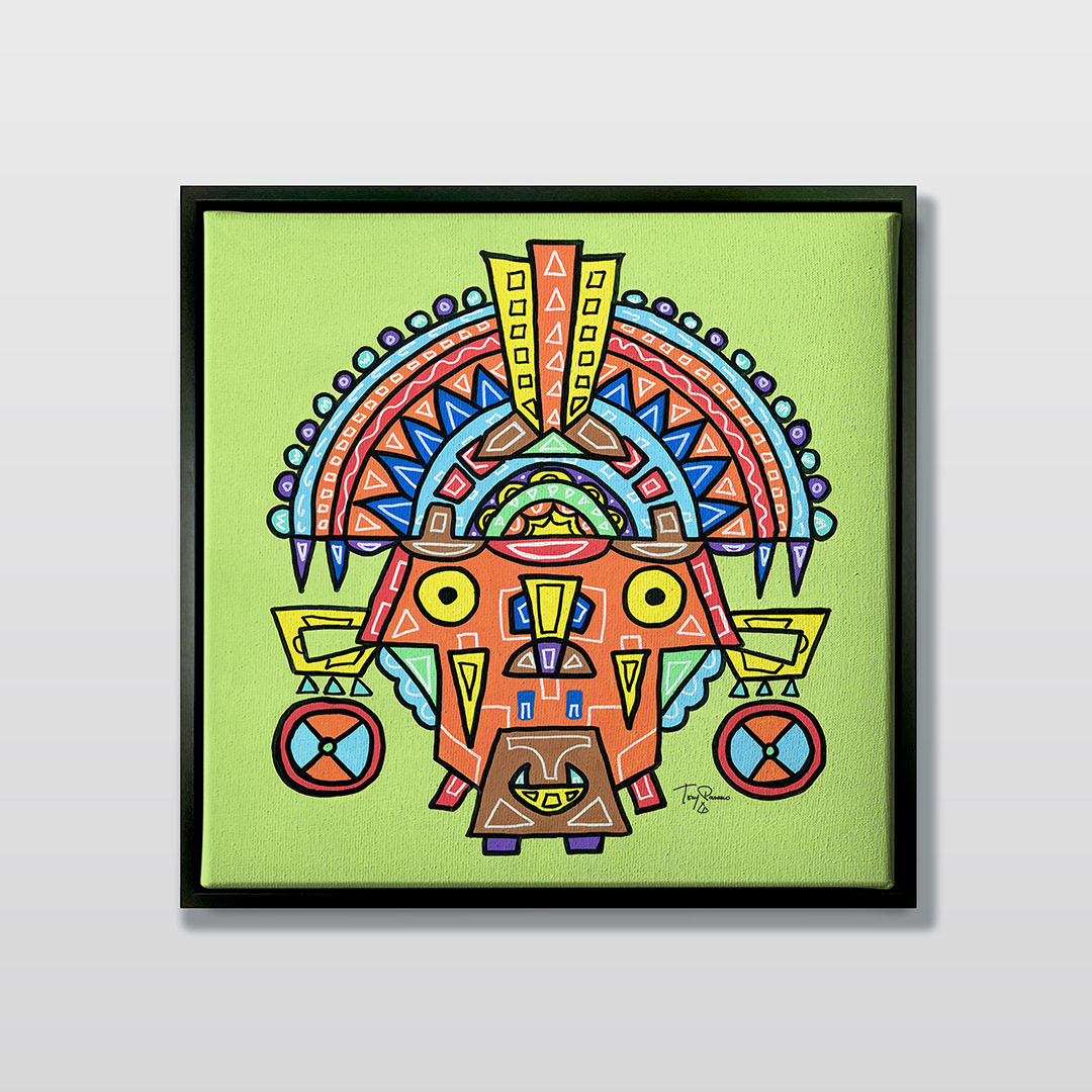 Series: ¡Hola! and ¡Adios! Mural Media: Acrylic and Ink on Canvas Size: 24h x 24w x 1.5d inches Framed Size: 25.5h x 25.5w x 2d inches