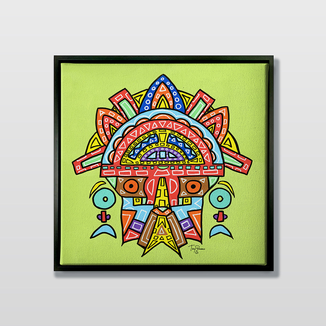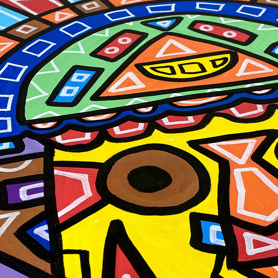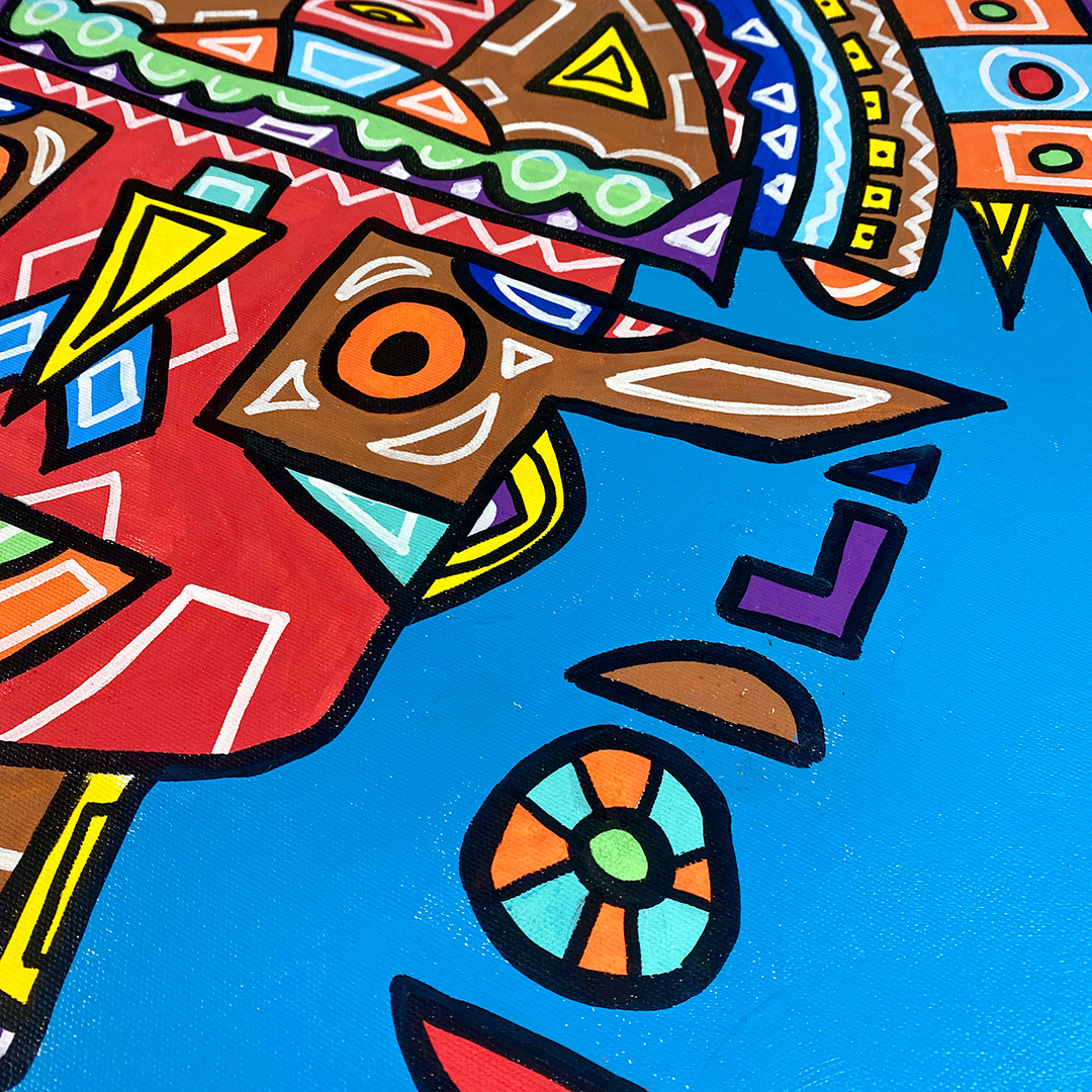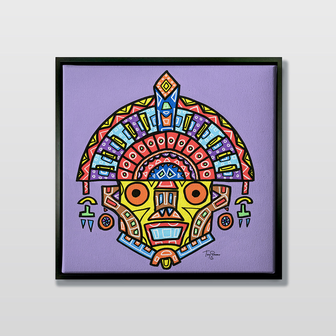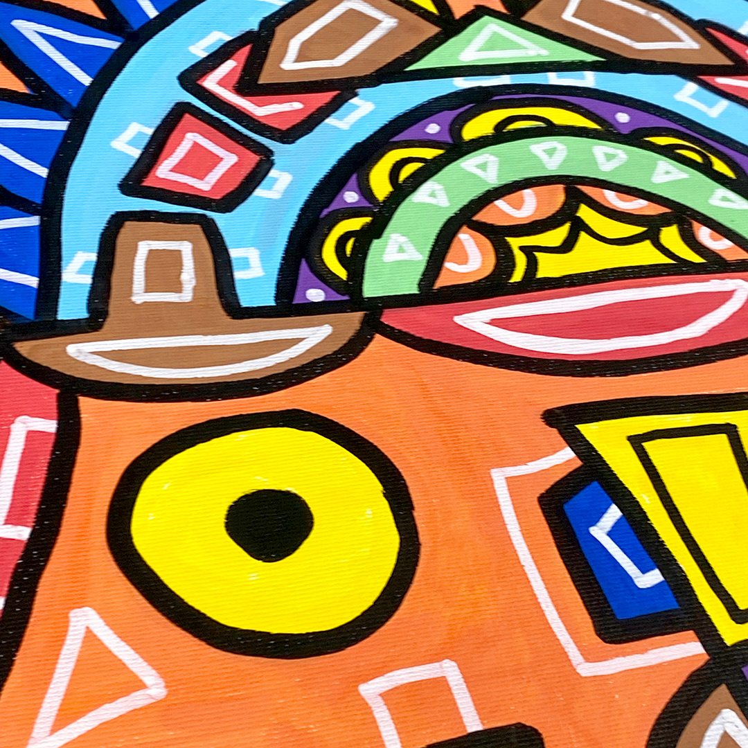 Series: ¡Hola! and ¡Adios! Mural Media: Acrylic and Ink on Canvas Size: 24h x 24w x 1.5d inches Framed Size: 25.5h x 25.5w x 2d inches