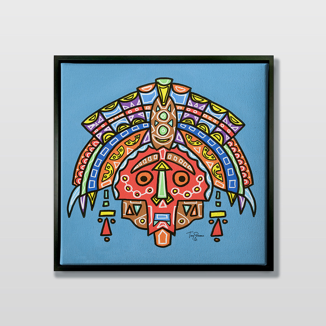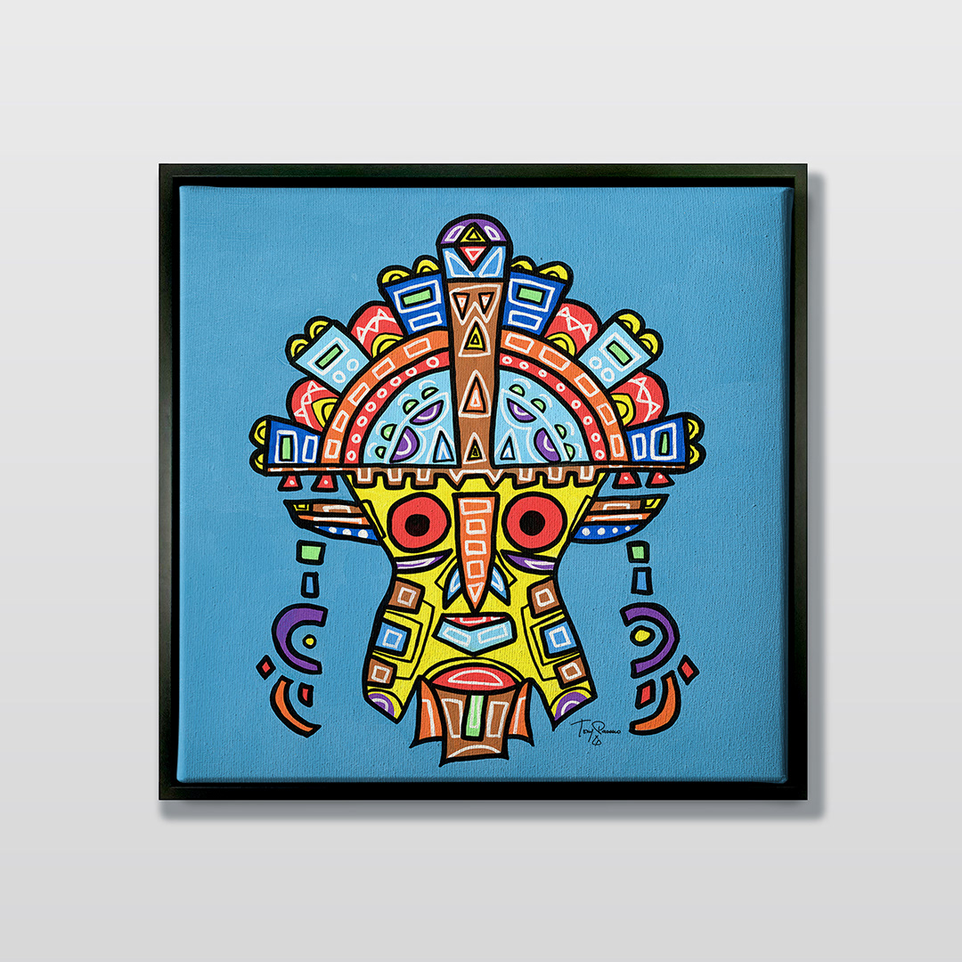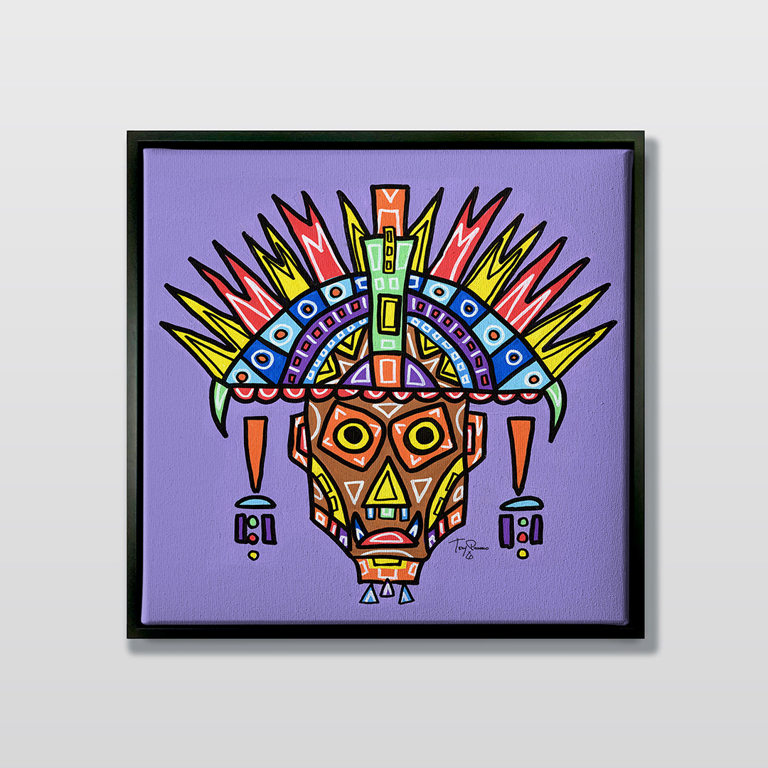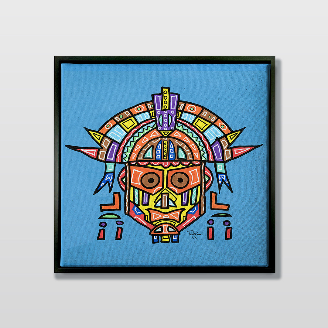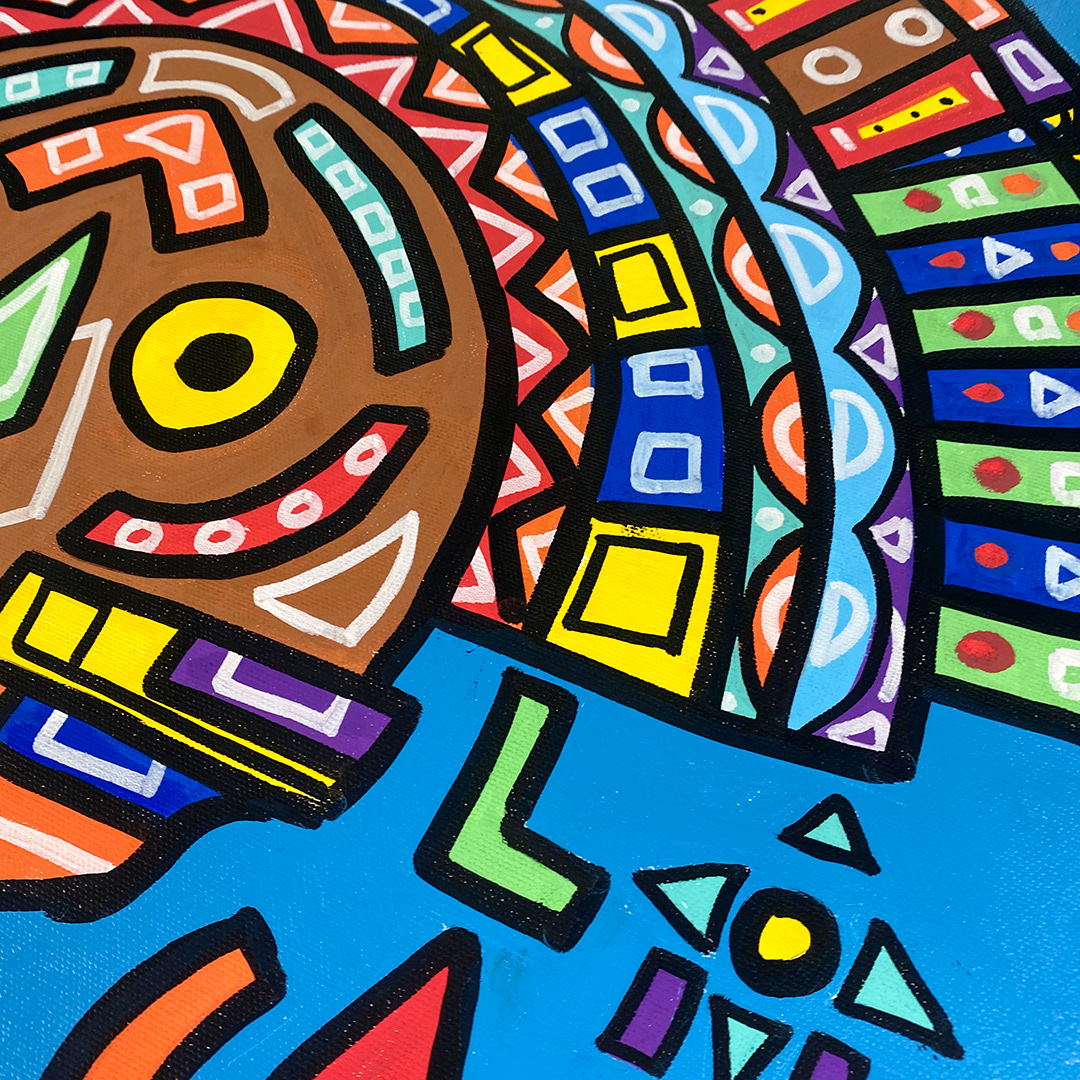 Series: ¡Hola! and ¡Adios! Mural Media: Acrylic and Ink on Canvas Size: 24h x 24w x 1.5d inches Framed Size: 25.5h x 25.5w x 2d inches