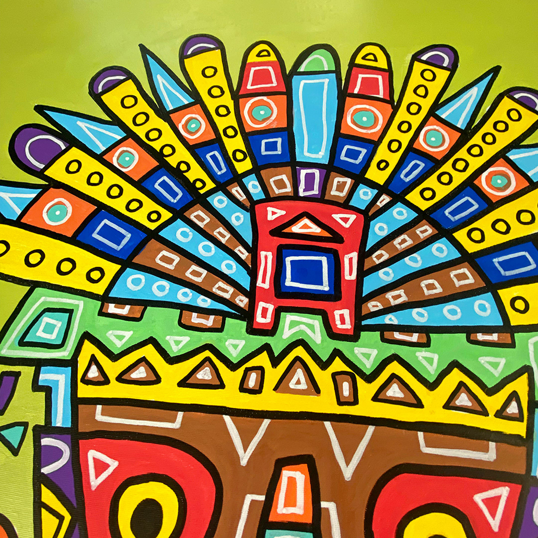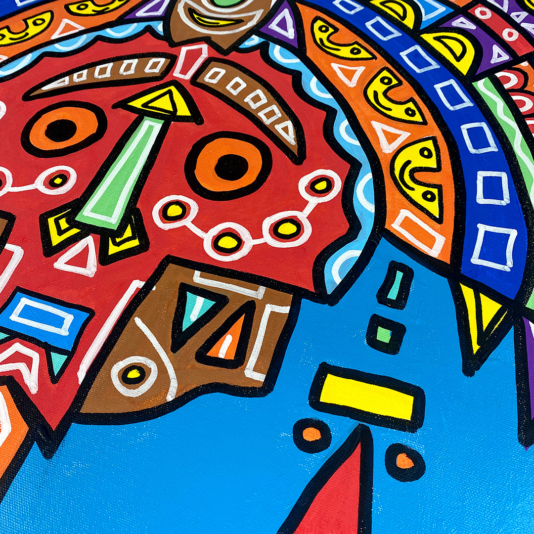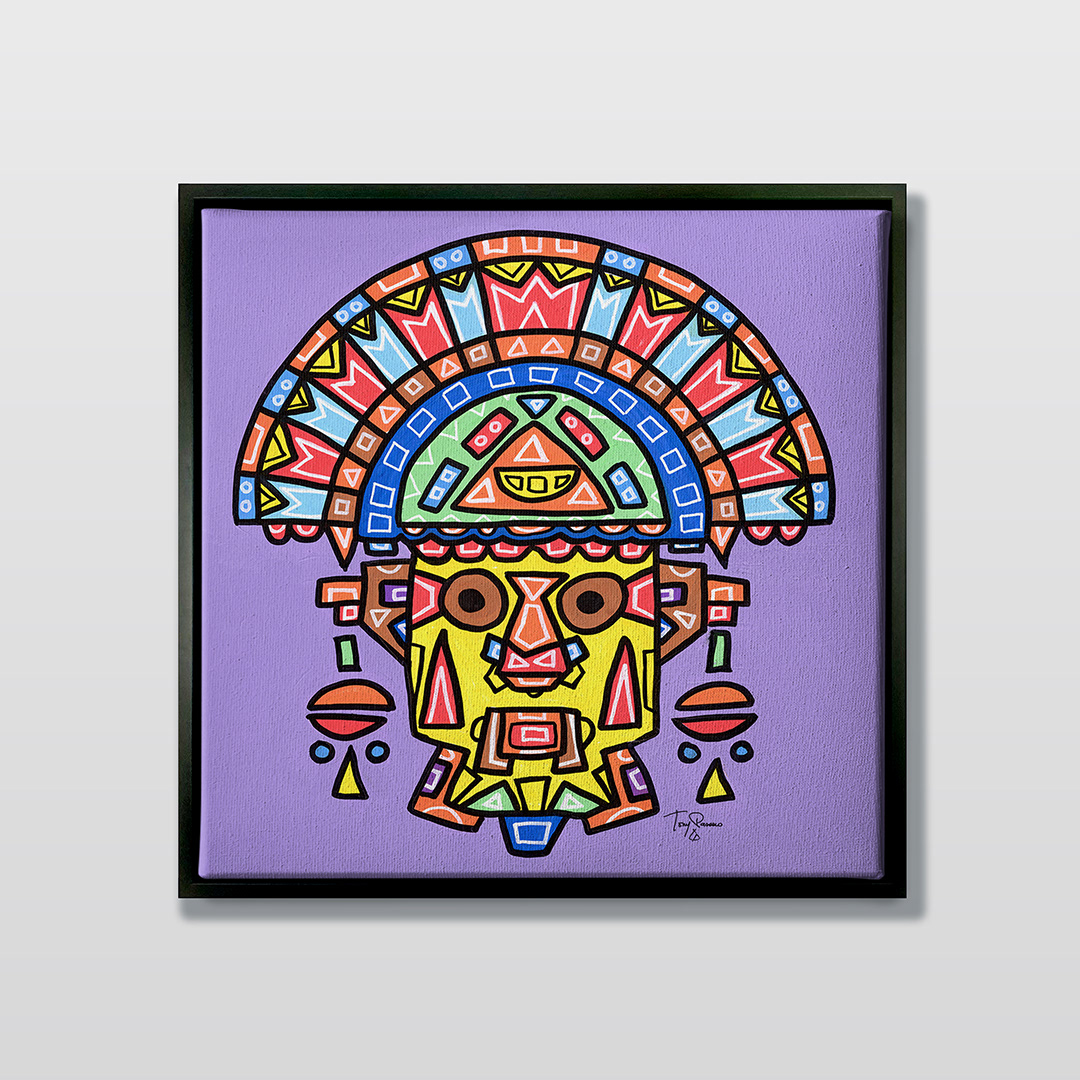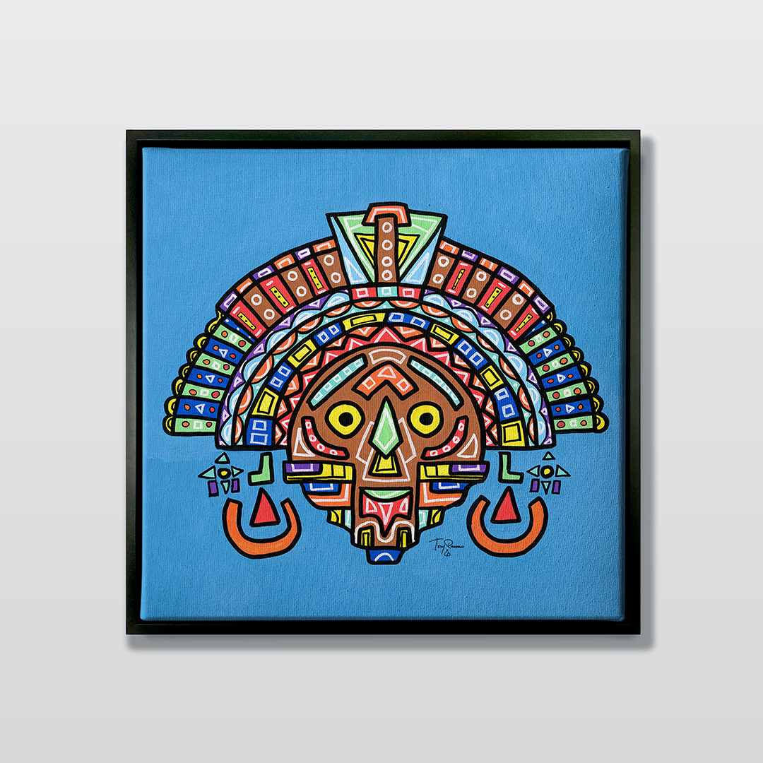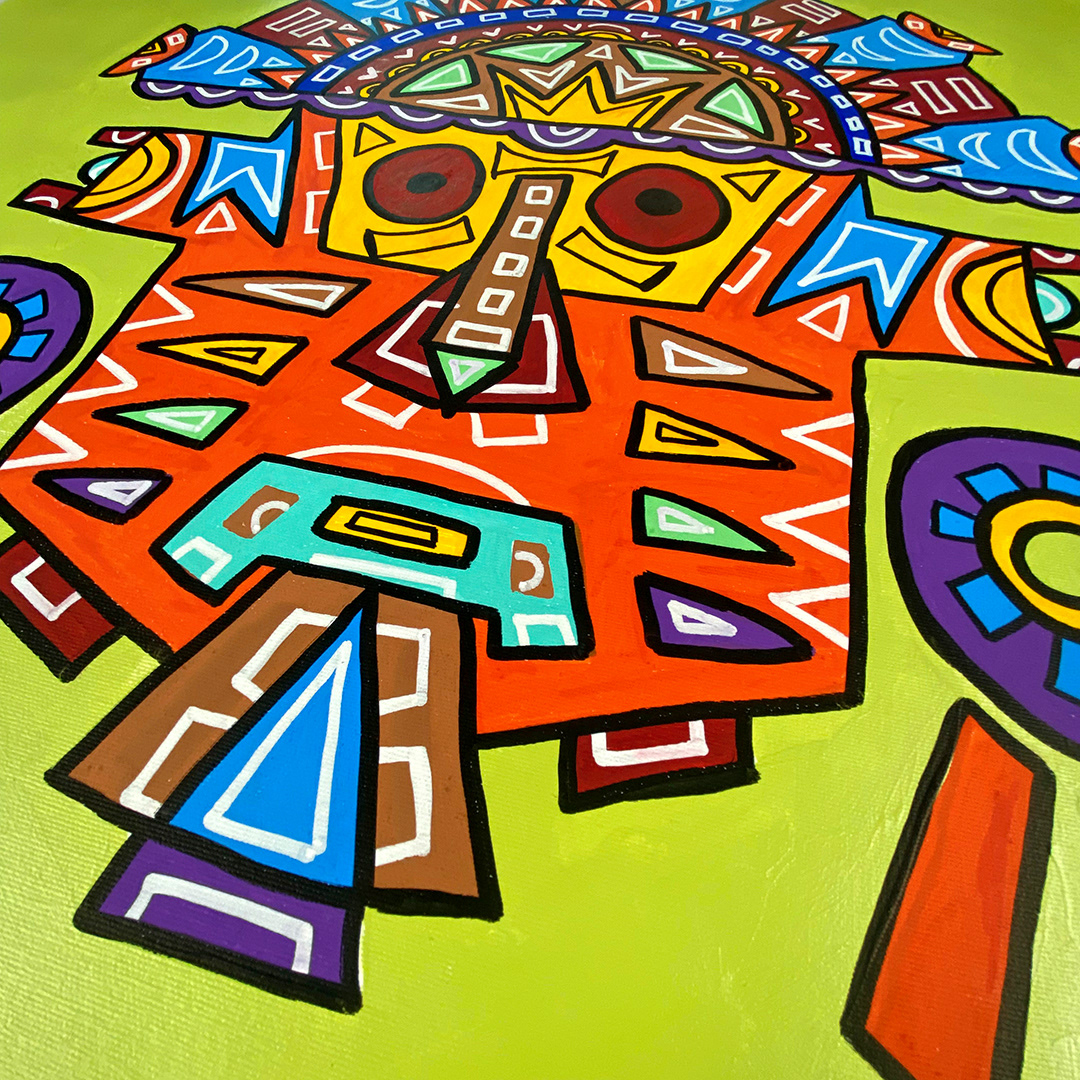 Series: ¡Hola! and ¡Adios! Mural Media: Acrylic and Ink on Canvas Size: 24h x 24w x 1.5d inches Framed Size: 25.5h x 25.5w x 2d inches