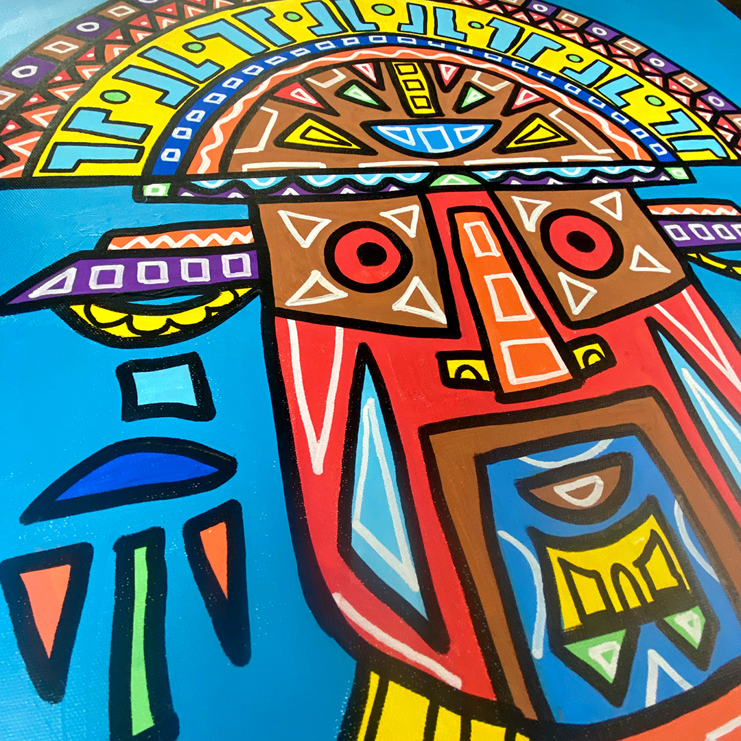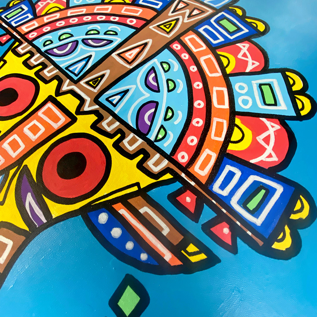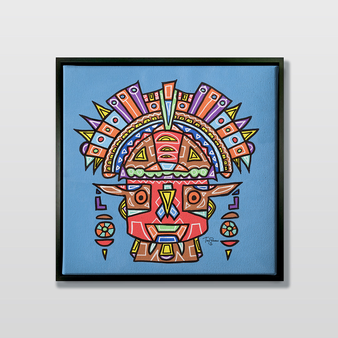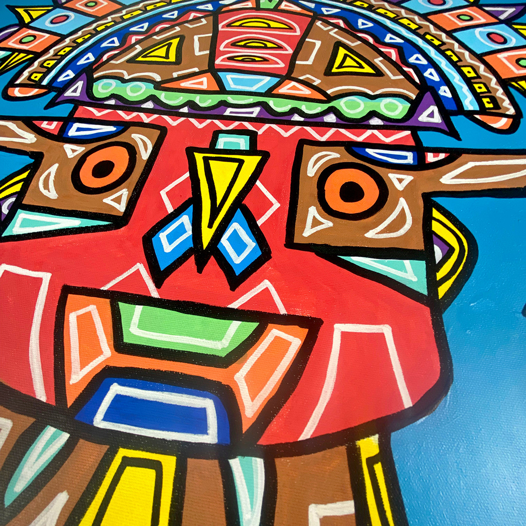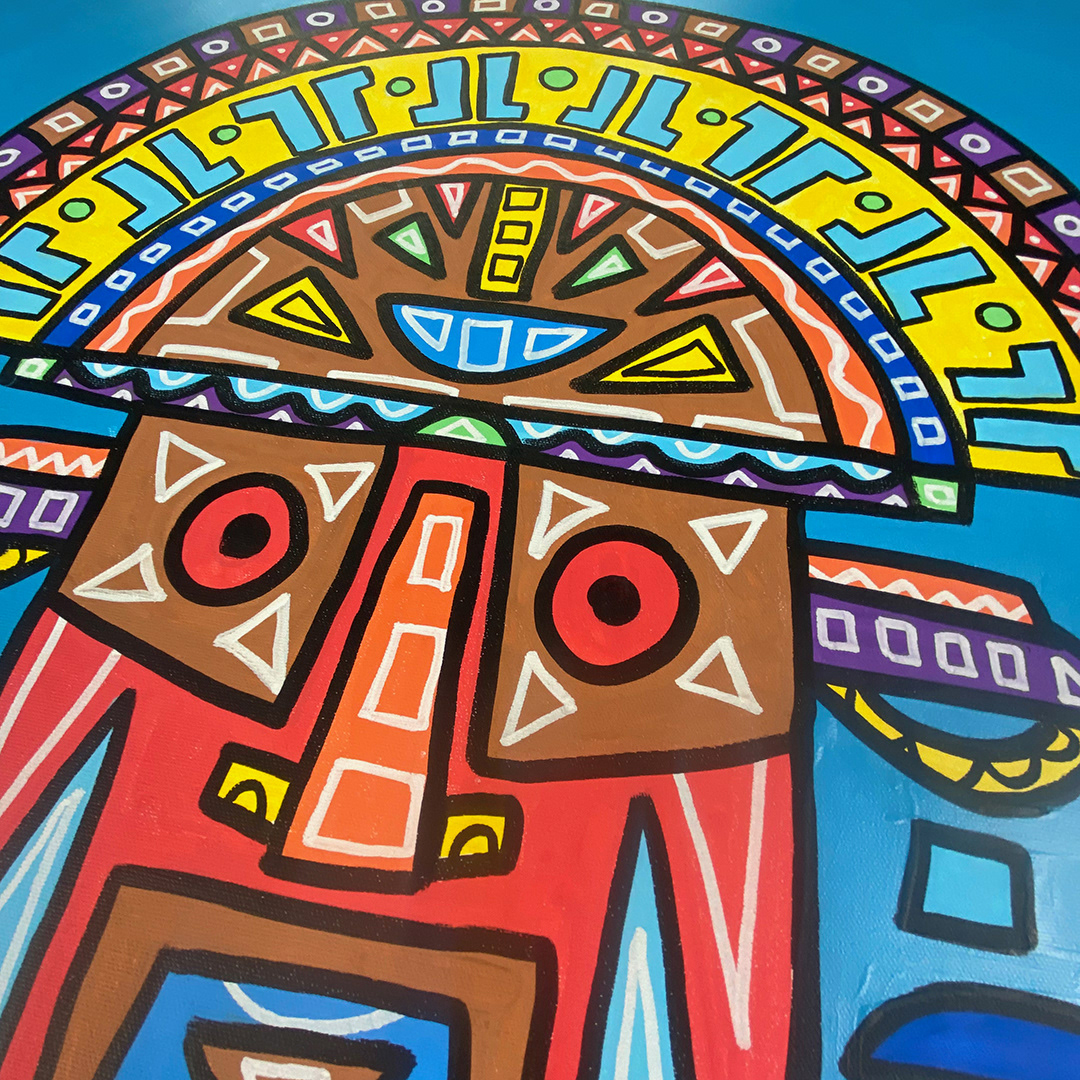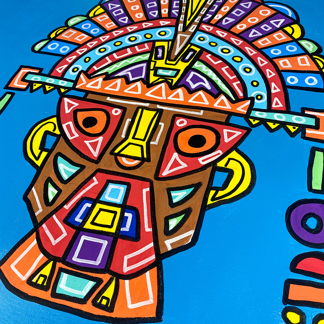 Series: ¡Hola! and ¡Adios! Mural Media: Acrylic and Ink on Canvas Size: 24h x 24w x 1.5d inches Framed Size: 25.5h x 25.5w x 2d inches
