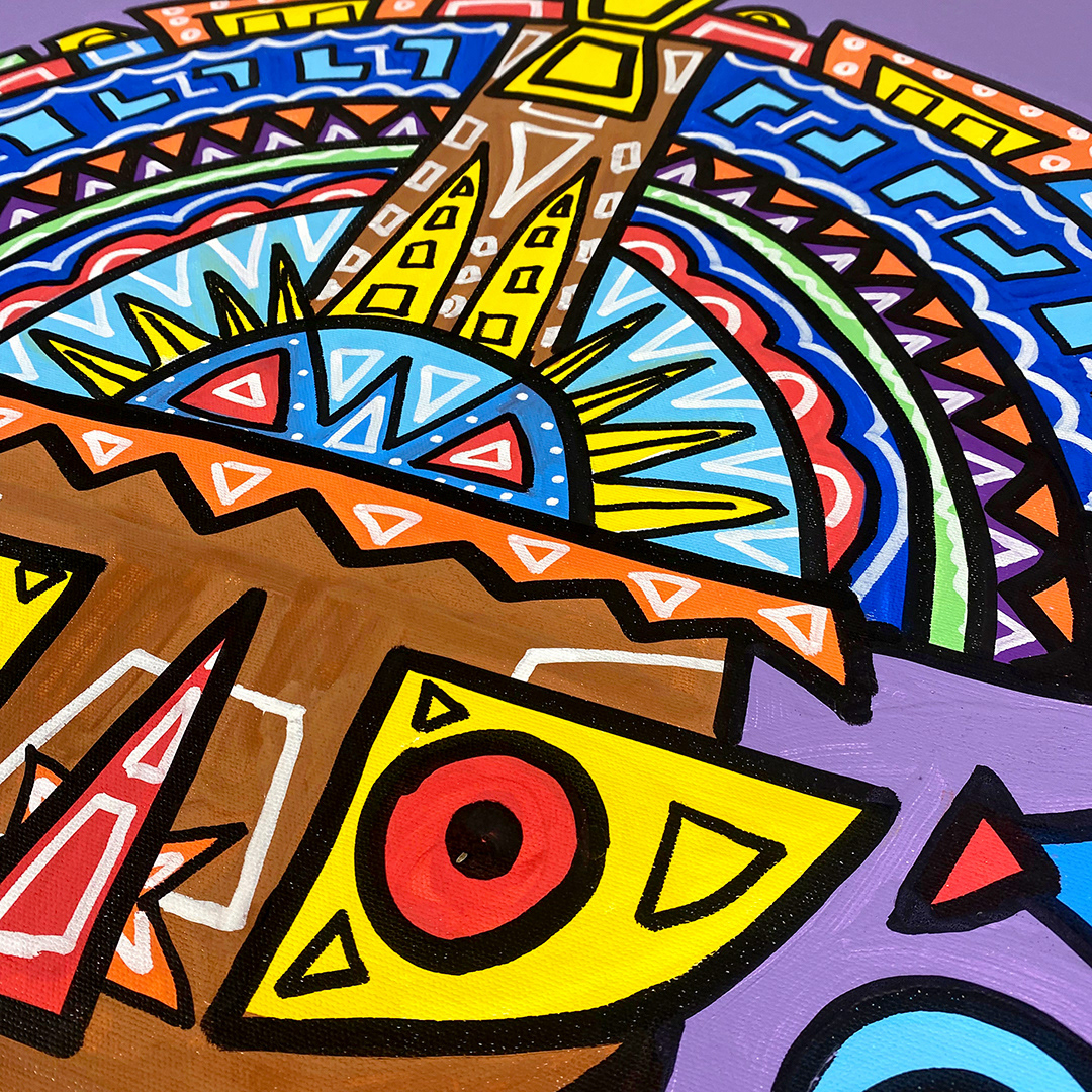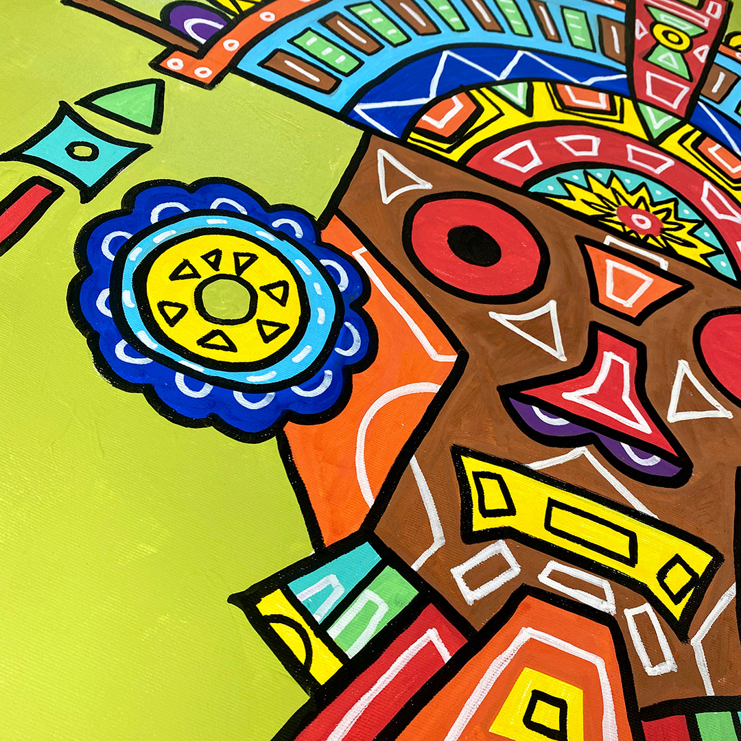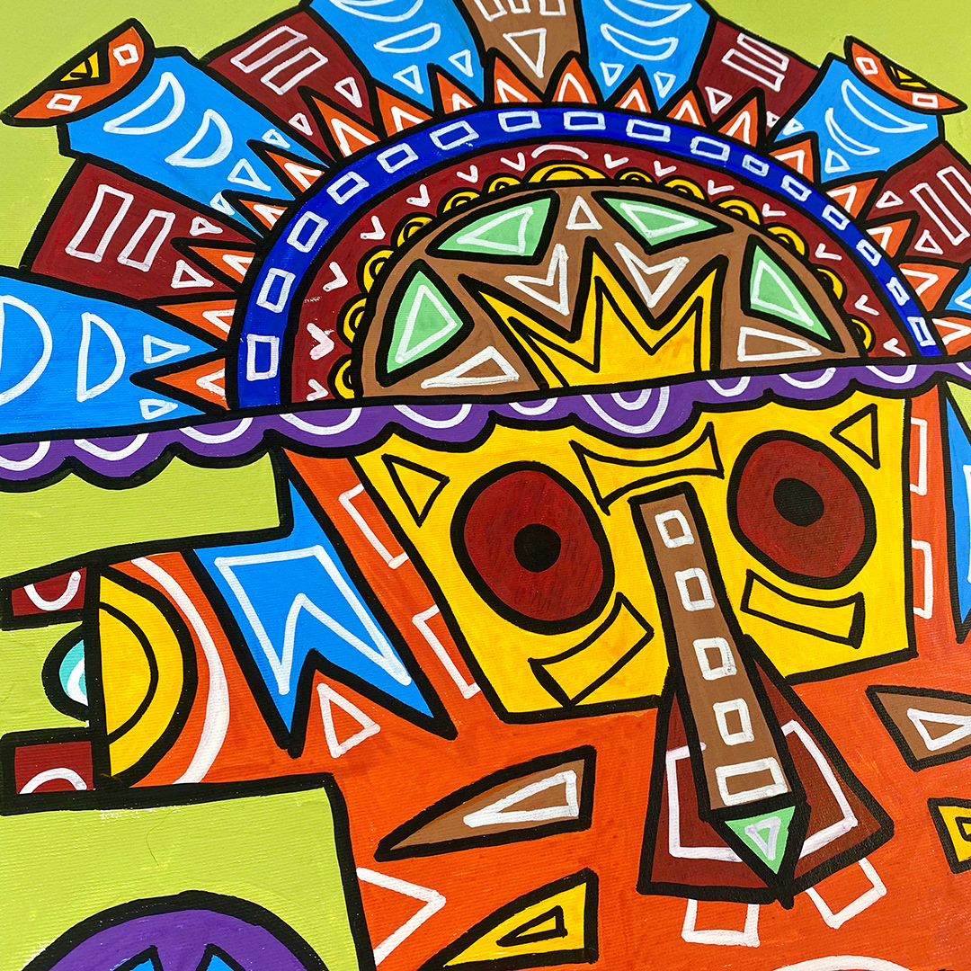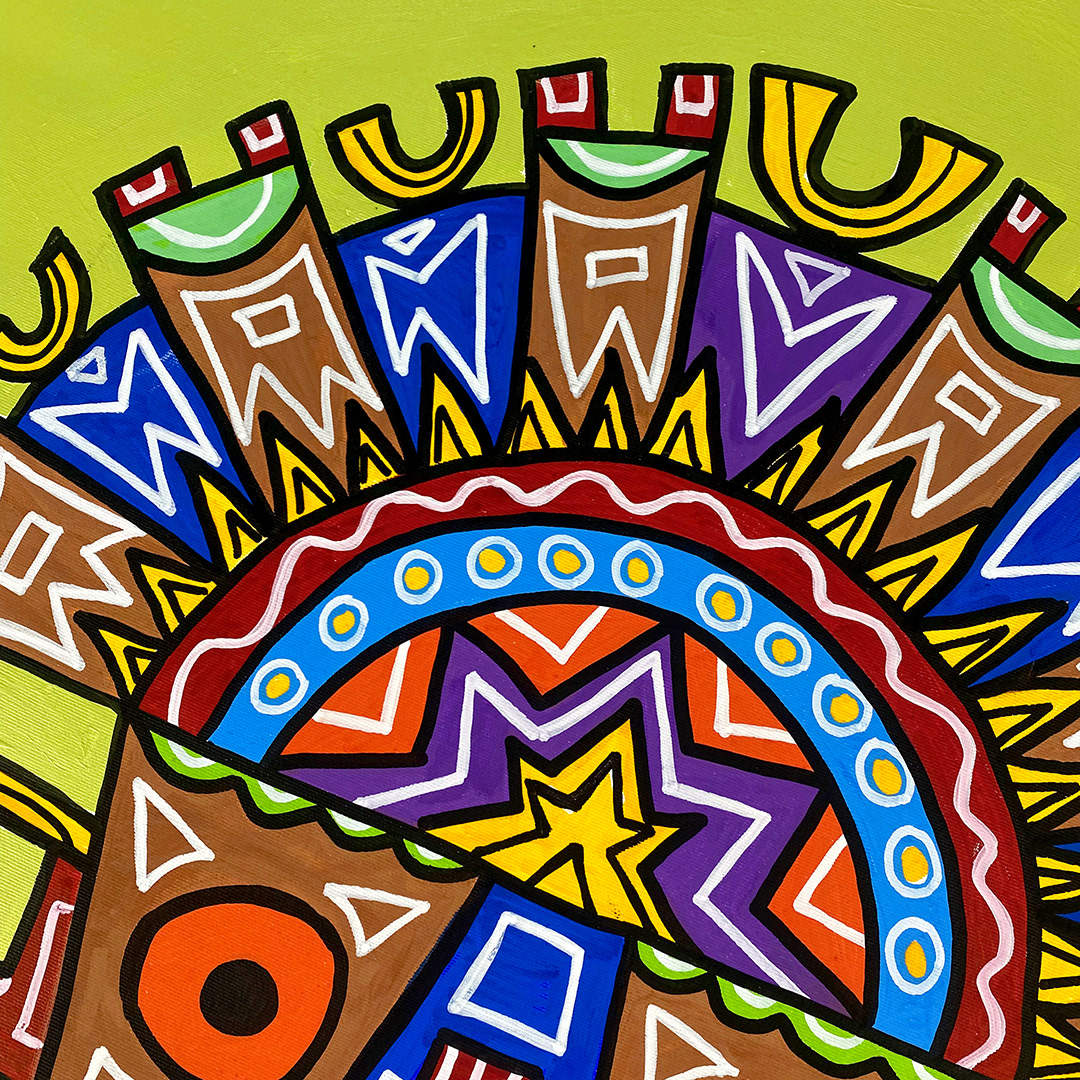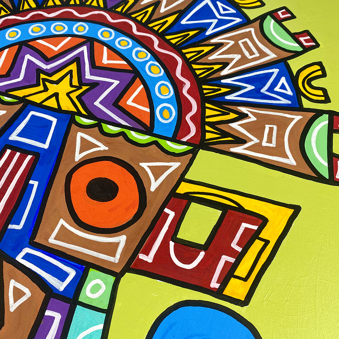 Series: ¡Hola! and ¡Adios! Mural Media: Acrylic and Ink on Canvas Size: 24h x 24w x 1.5d inches Framed Size: 25.5h x 25.5w x 2d inches
