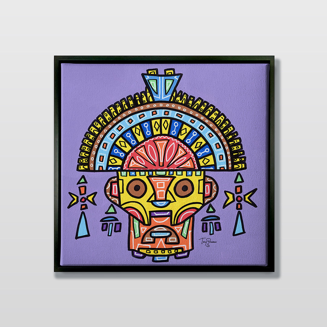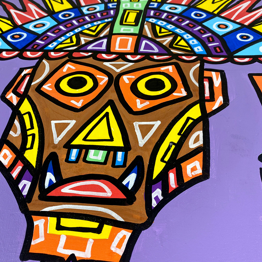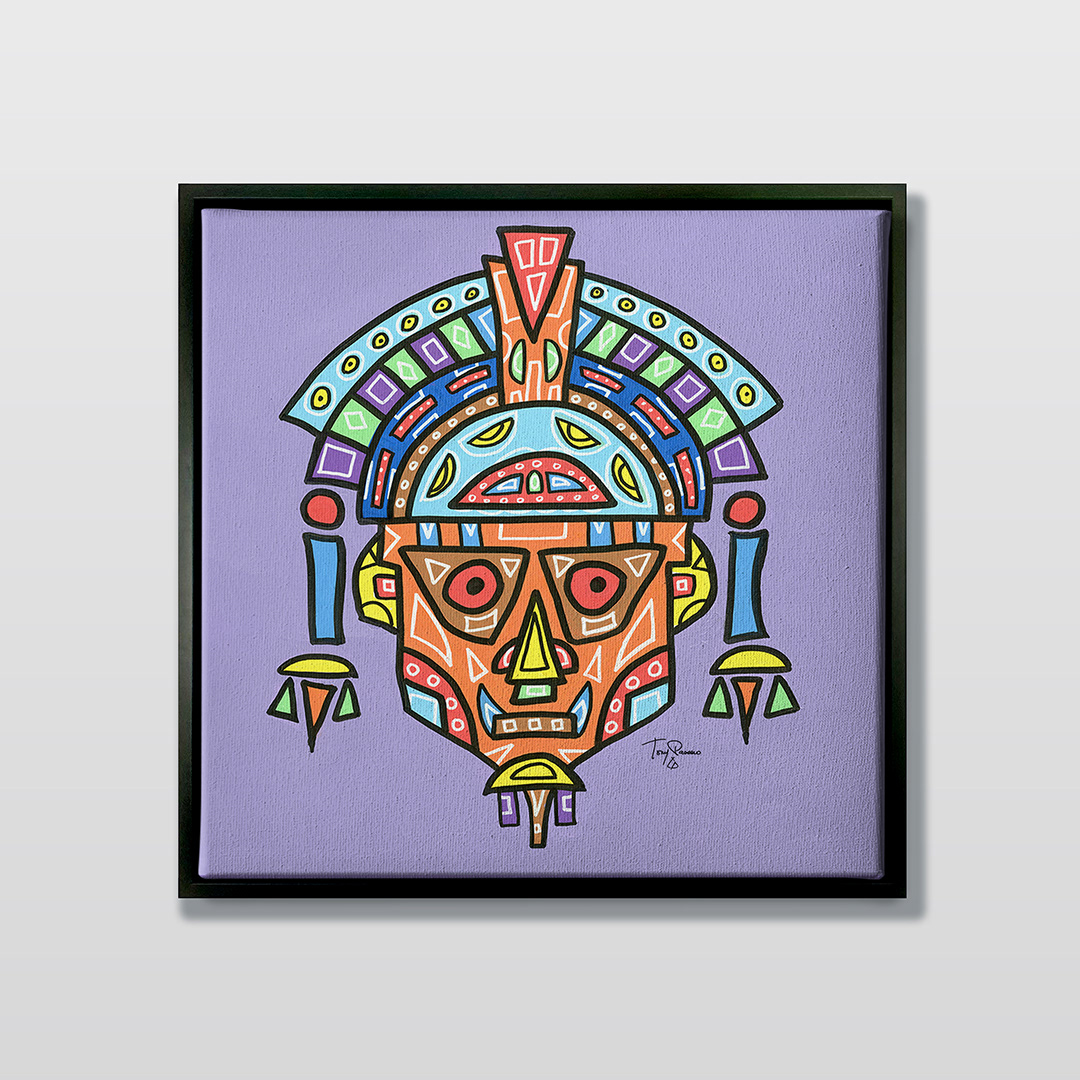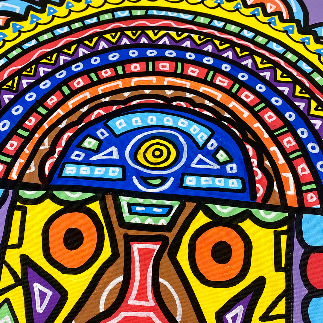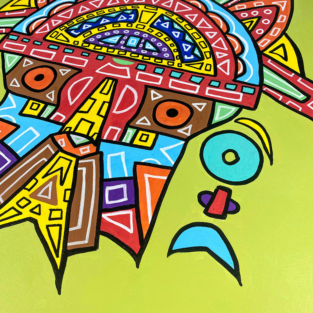 Series: ¡Hola! and ¡Adios! Mural Media: Acrylic and Ink on Canvas Size: 24h x 24w x 1.5d inches Framed Size: 25.5h x 25.5w x 2d inches