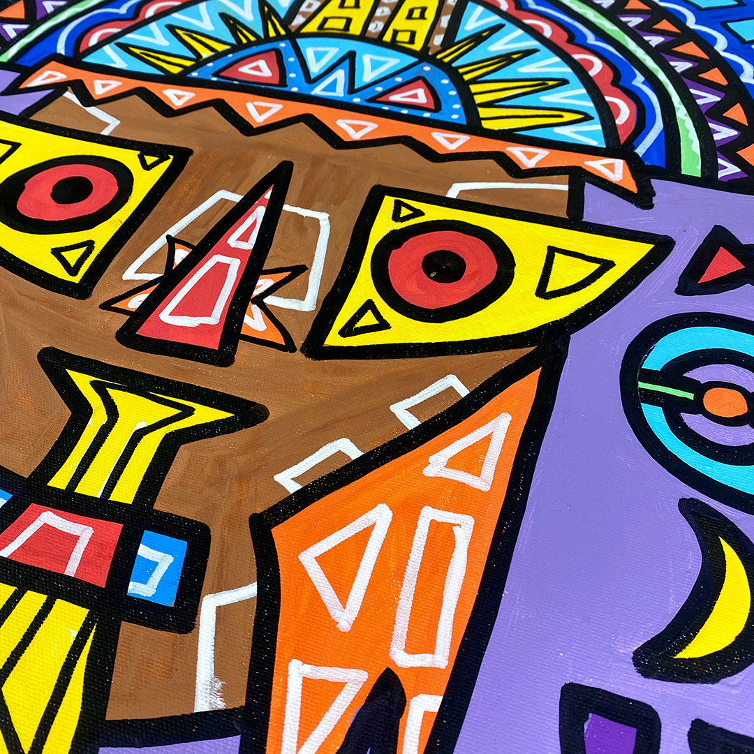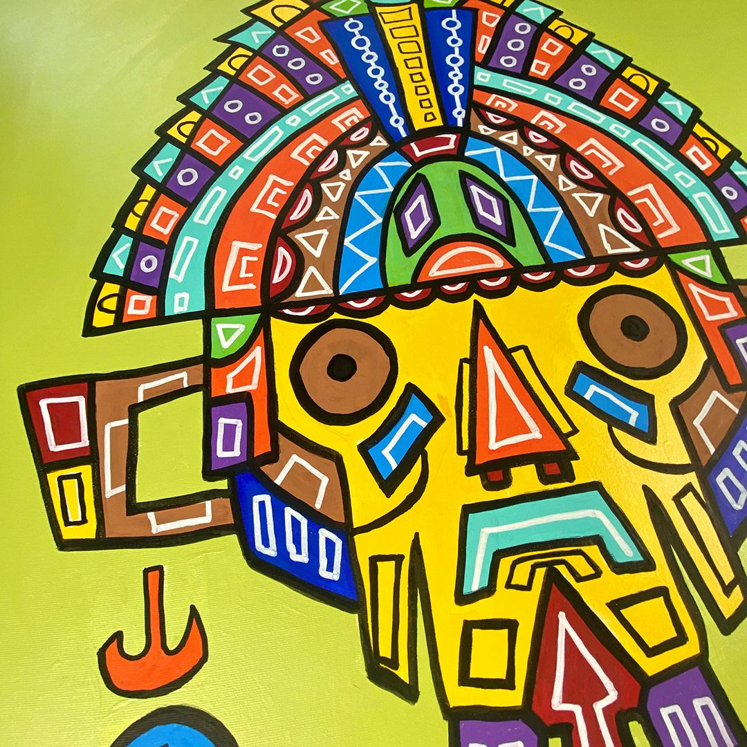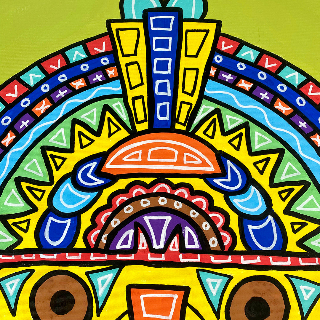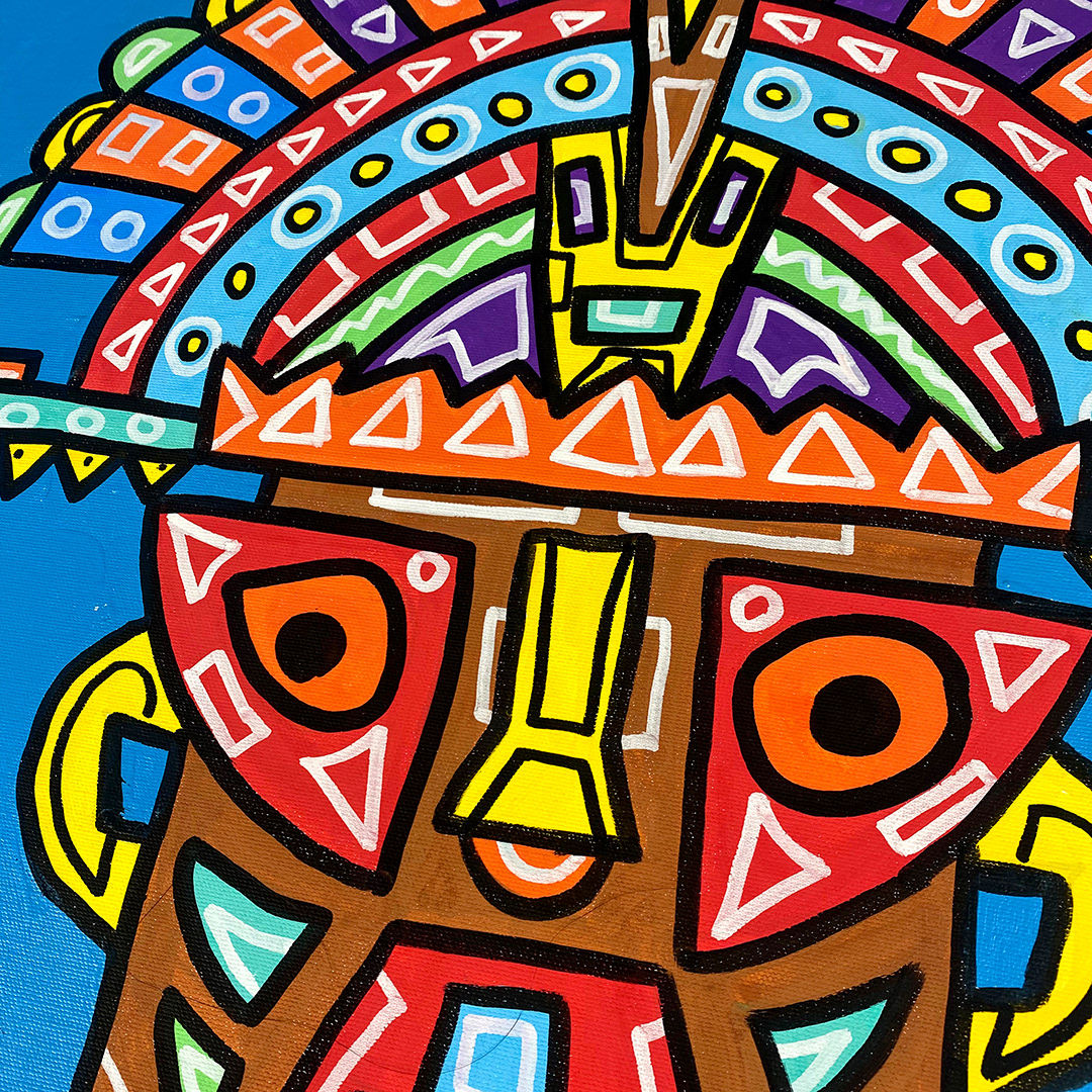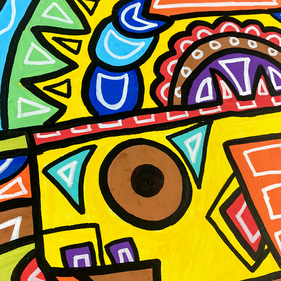 Series: ¡Hola! and ¡Adios! Mural Media: Acrylic and Ink on Canvas Size: 24h x 24w x 1.5d inches Framed Size: 25.5h x 25.5w x 2d inches