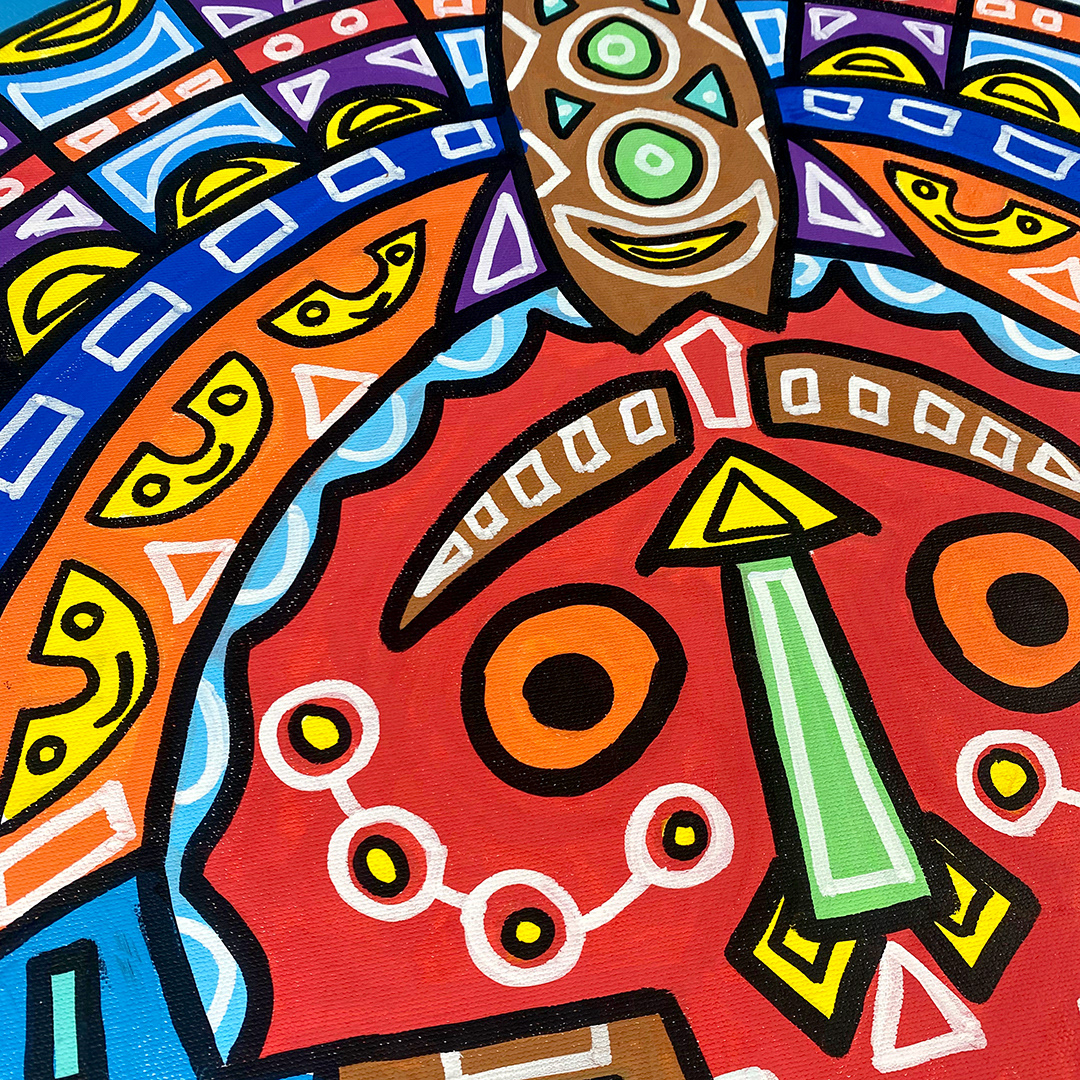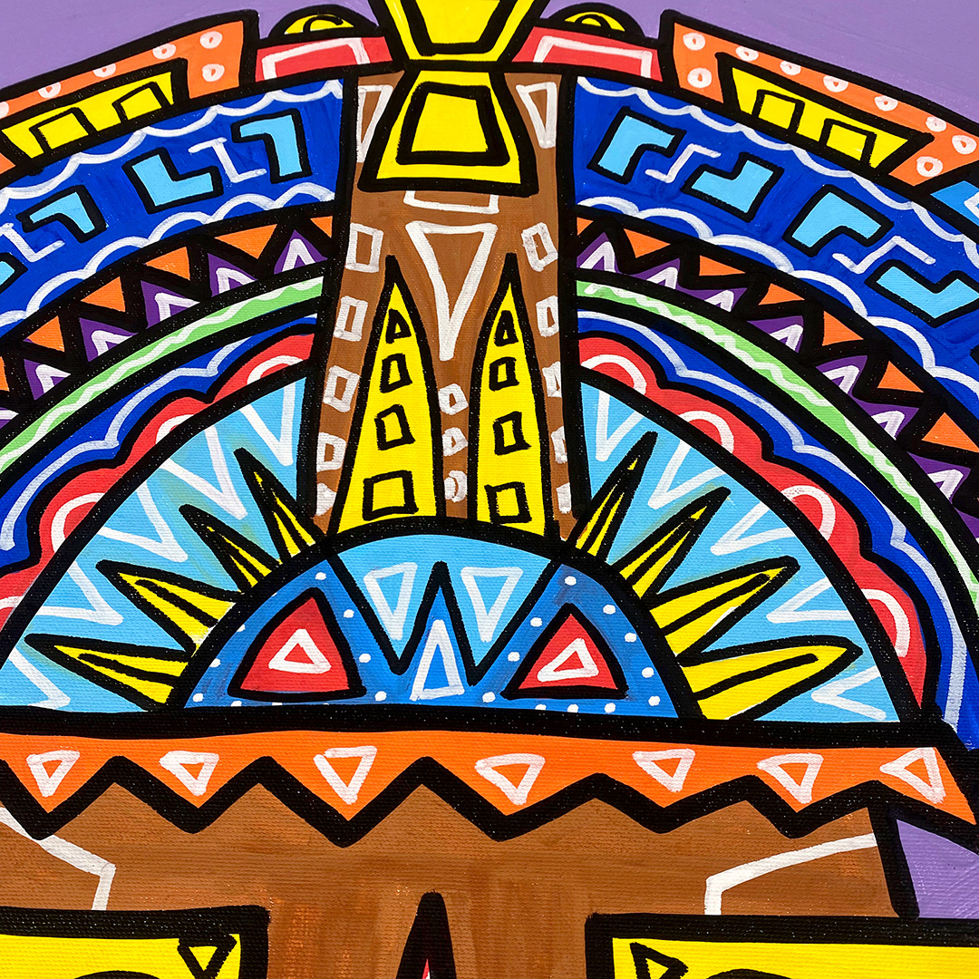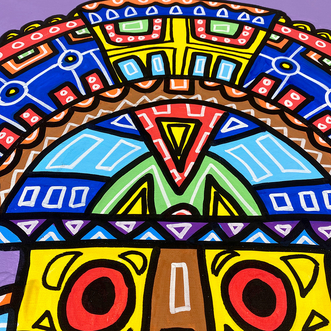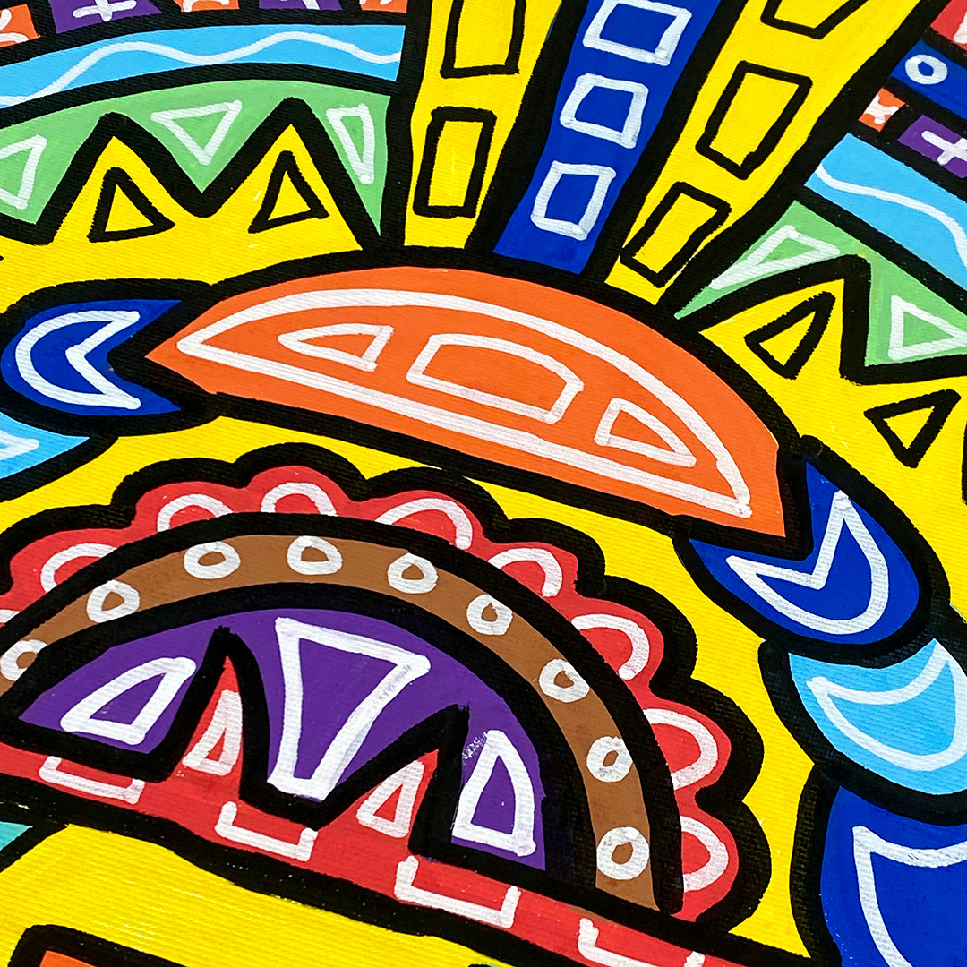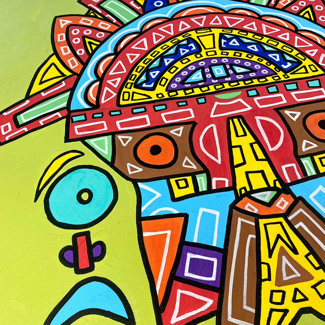 Series: ¡Hola! and ¡Adios! Mural Media: Acrylic and Ink on Canvas Size: 24h x 24w x 1.5d inches Framed Size: 25.5h x 25.5w x 2d inches