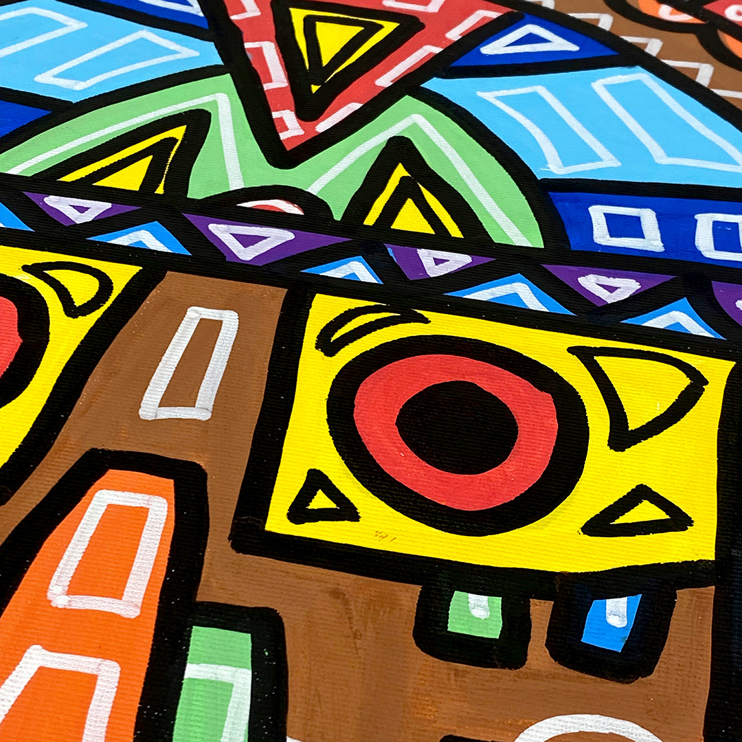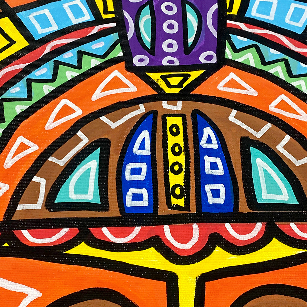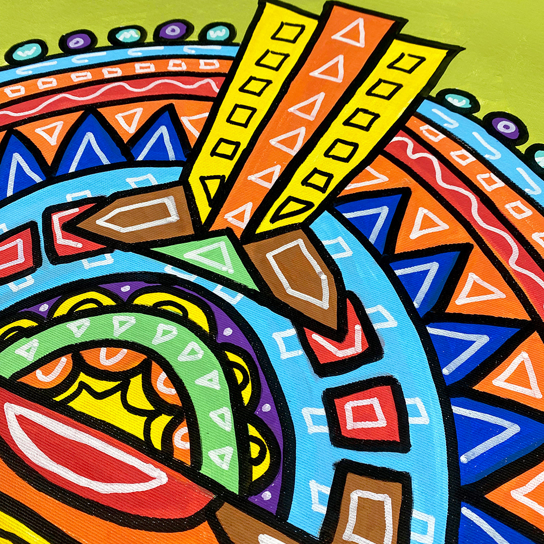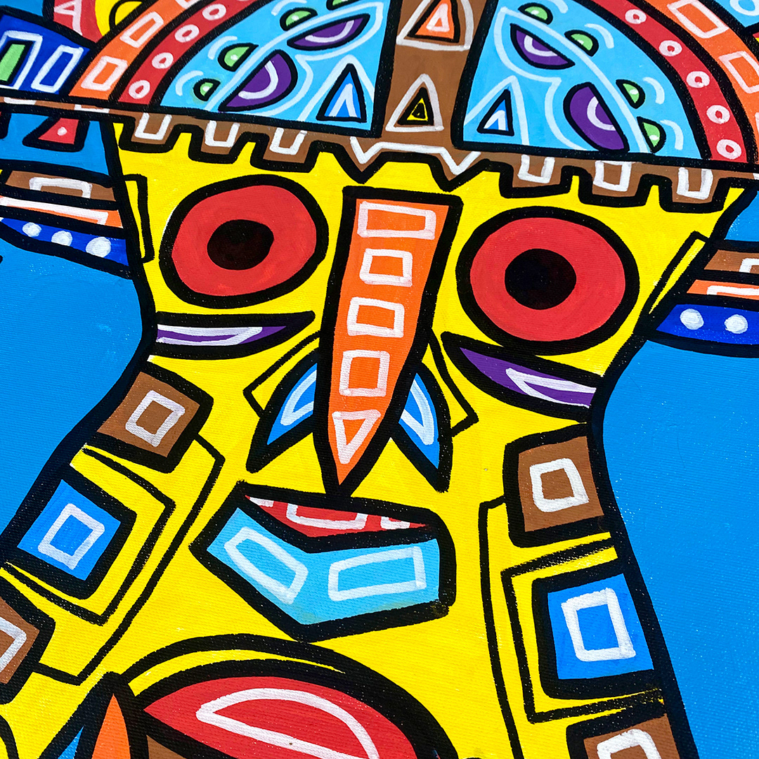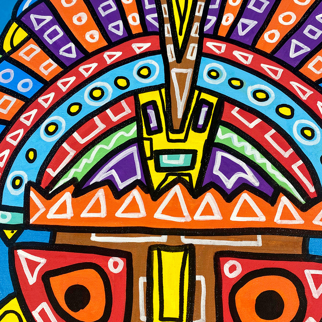 Series: ¡Hola! and ¡Adios! Mural Media: Acrylic and Ink on Canvas Size: 24h x 24w x 1.5d inches Framed Size: 25.5h x 25.5w x 2d inches
