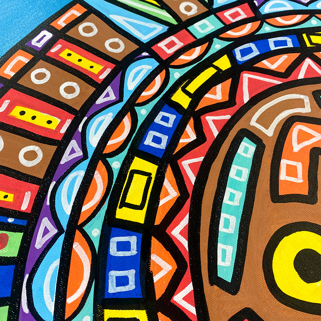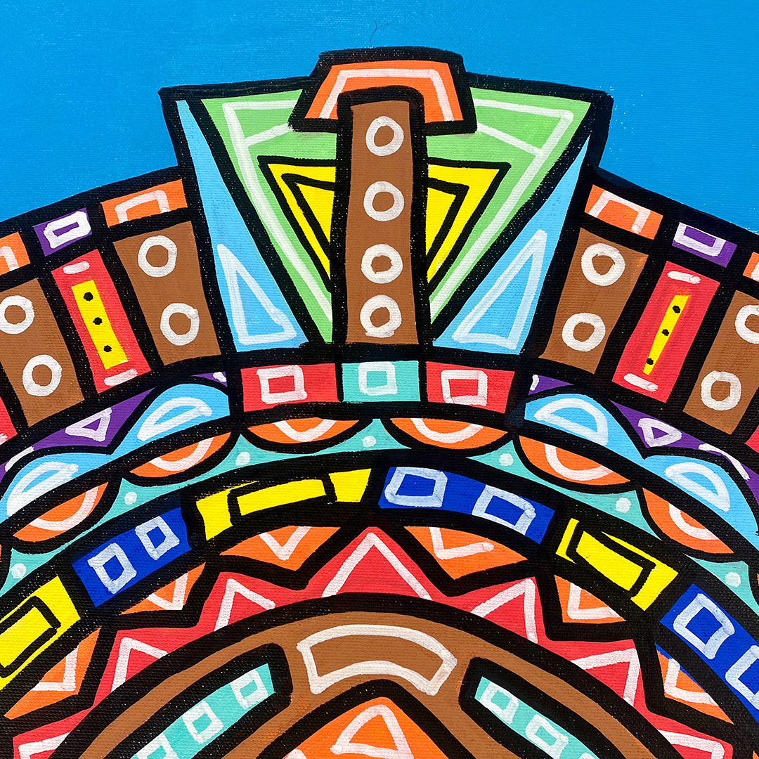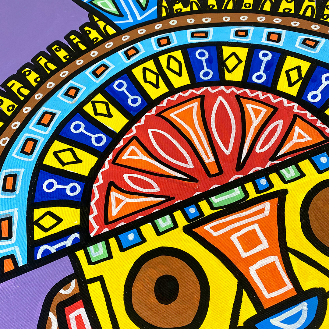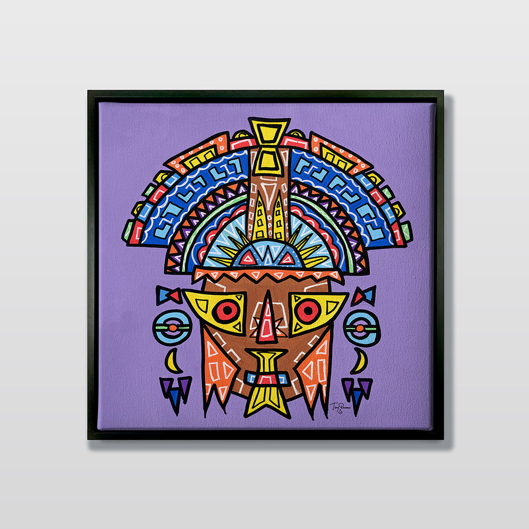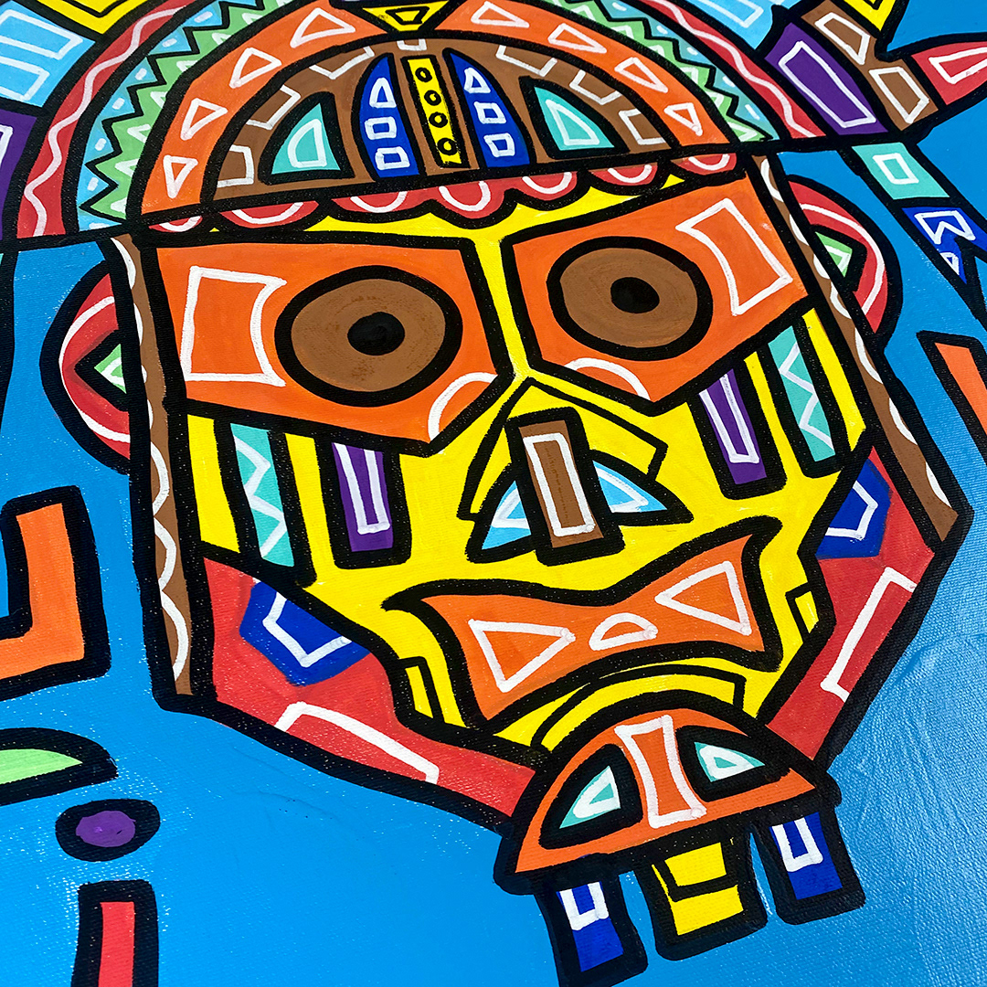 Series: ¡Hola! and ¡Adios! Mural Media: Acrylic and Ink on Canvas Size: 24h x 24w x 1.5d inches Framed Size: 25.5h x 25.5w x 2d inches