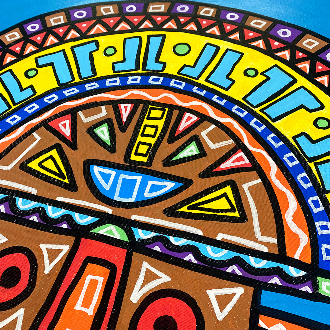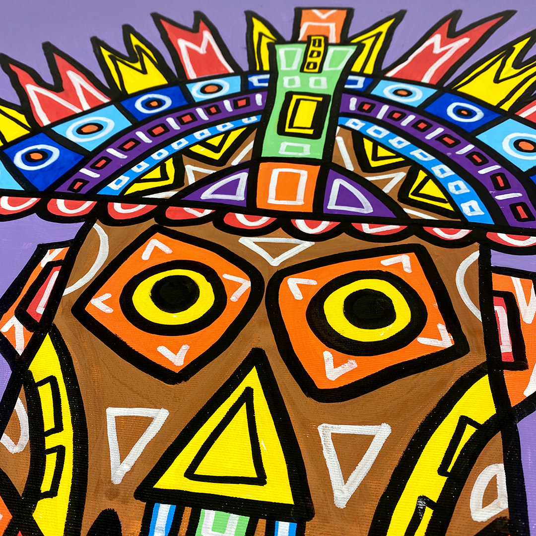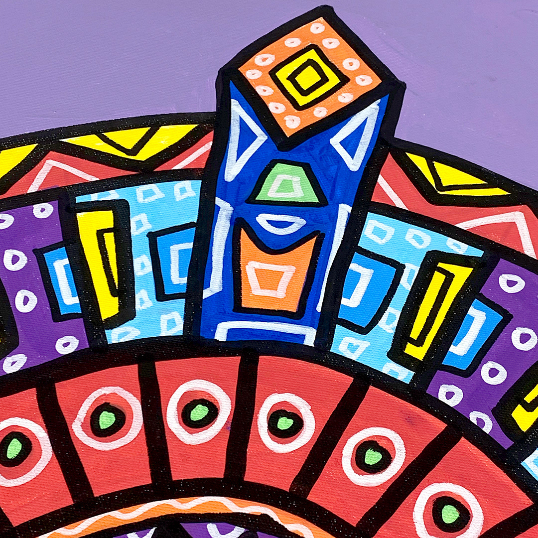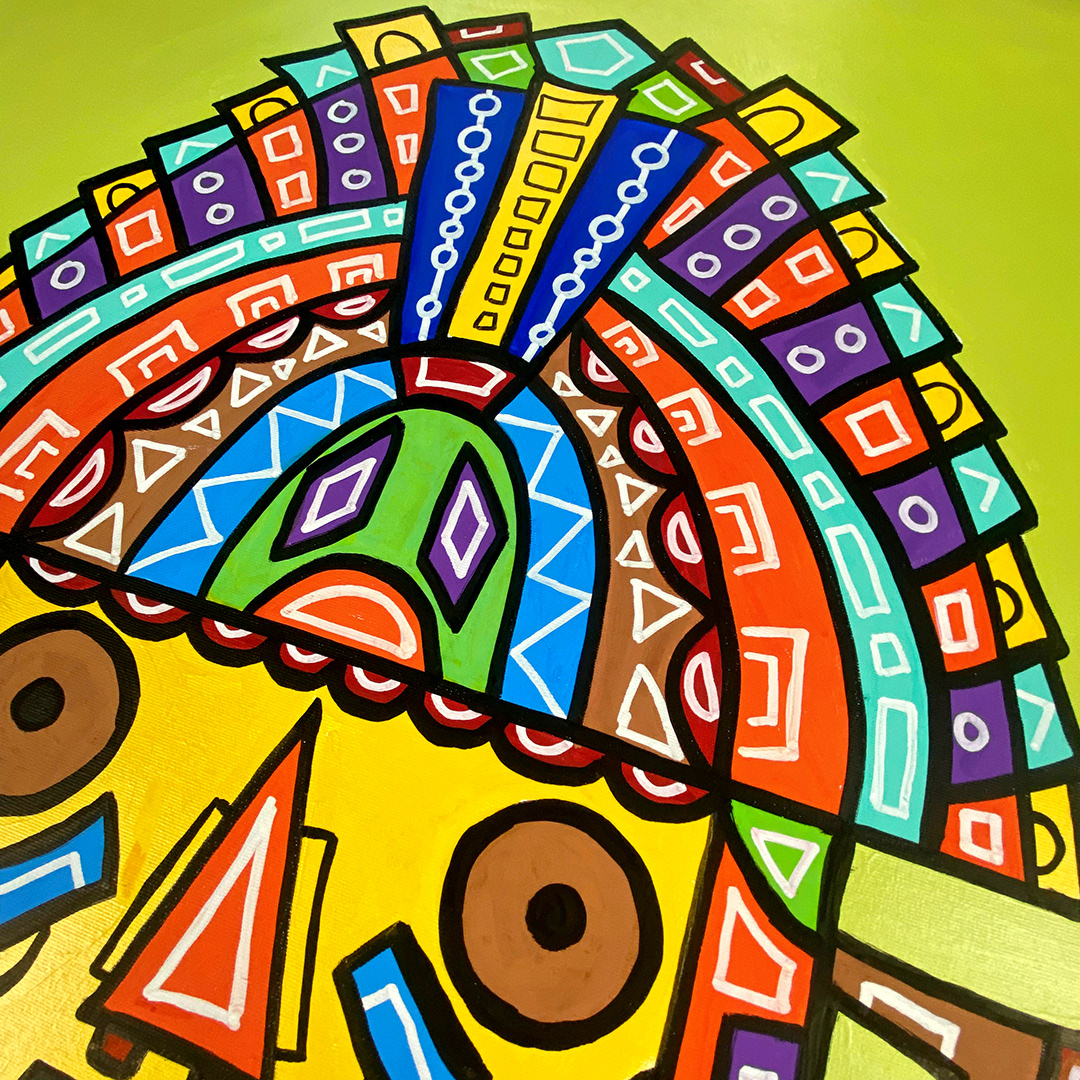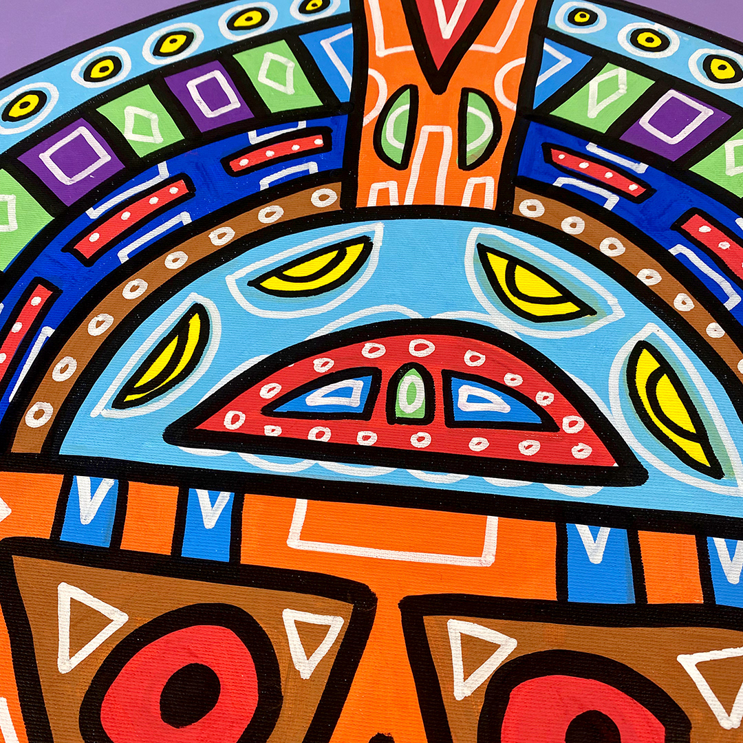 Series: ¡Hola! and ¡Adios! Mural Media: Acrylic and Ink on Canvas Size: 24h x 24w x 1.5d inches Framed Size: 25.5h x 25.5w x 2d inches