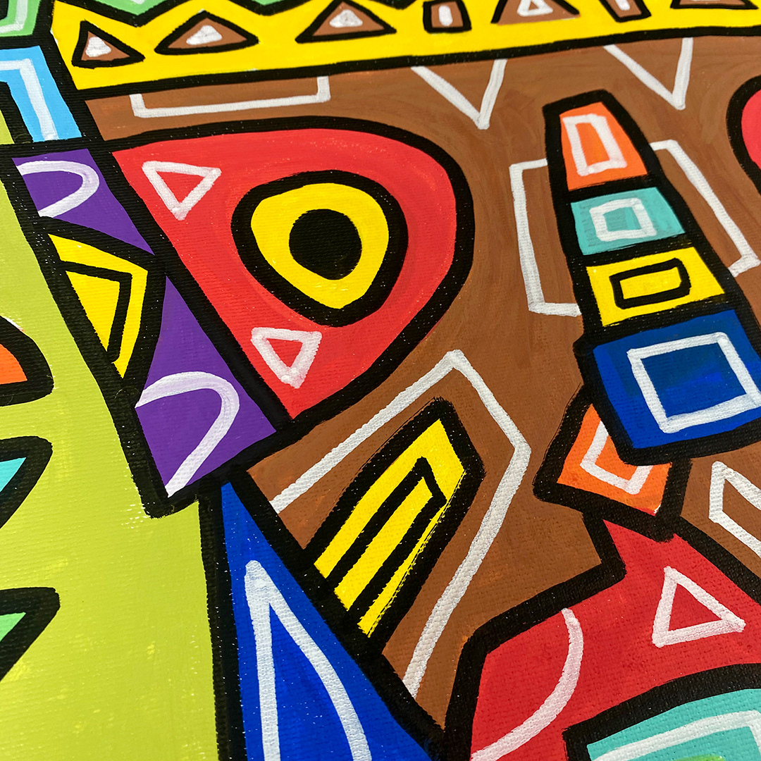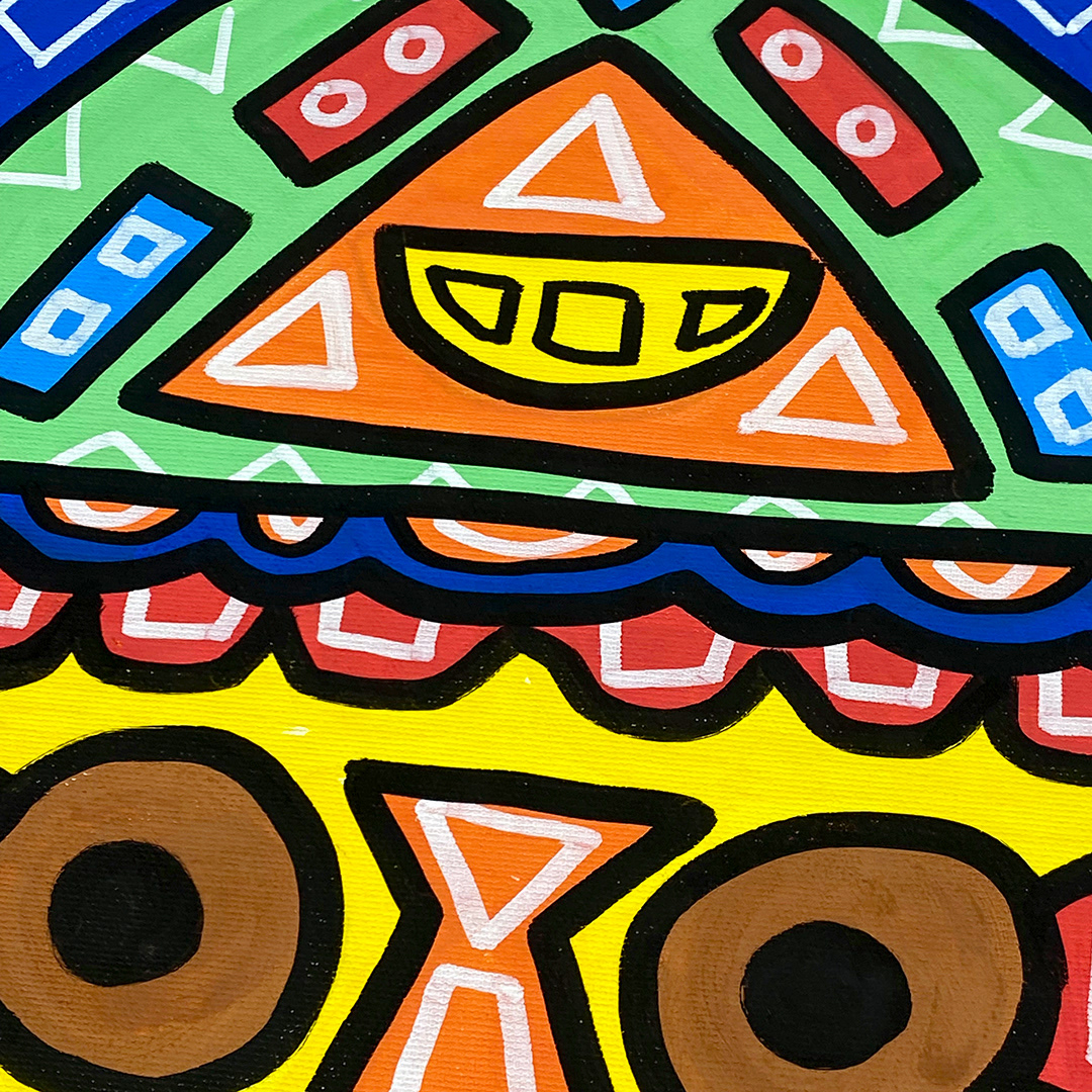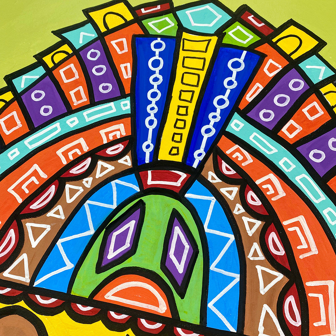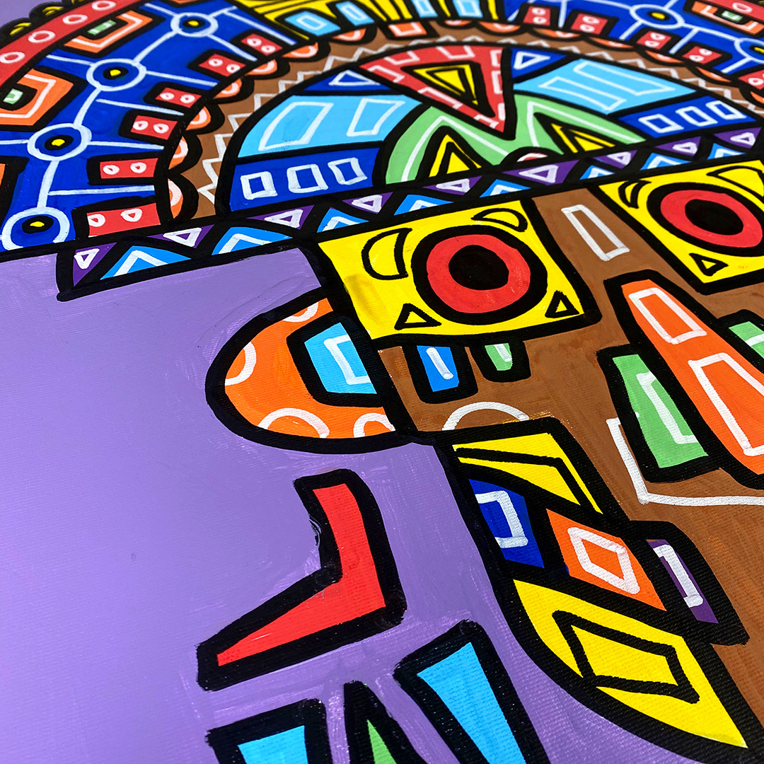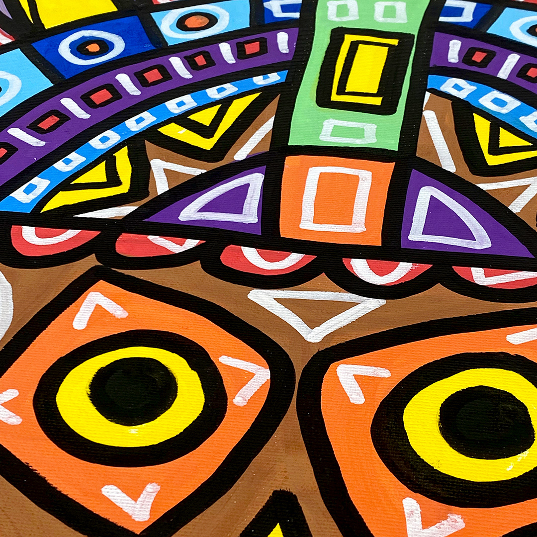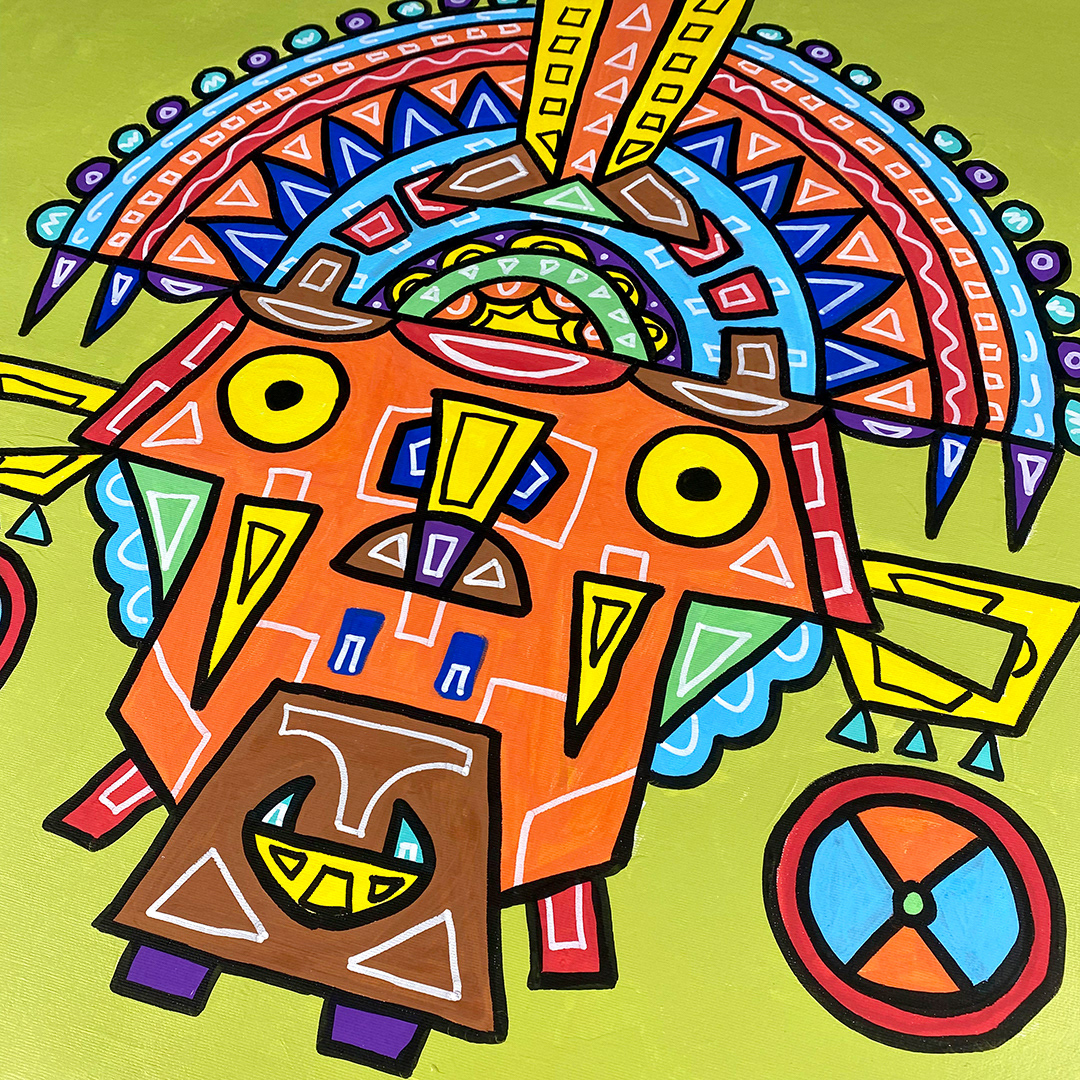 Series: ¡Hola! and ¡Adios! Mural Media: Acrylic and Ink on Canvas Size: 24h x 24w x 1.5d inches Framed Size: 25.5h x 25.5w x 2d inches
