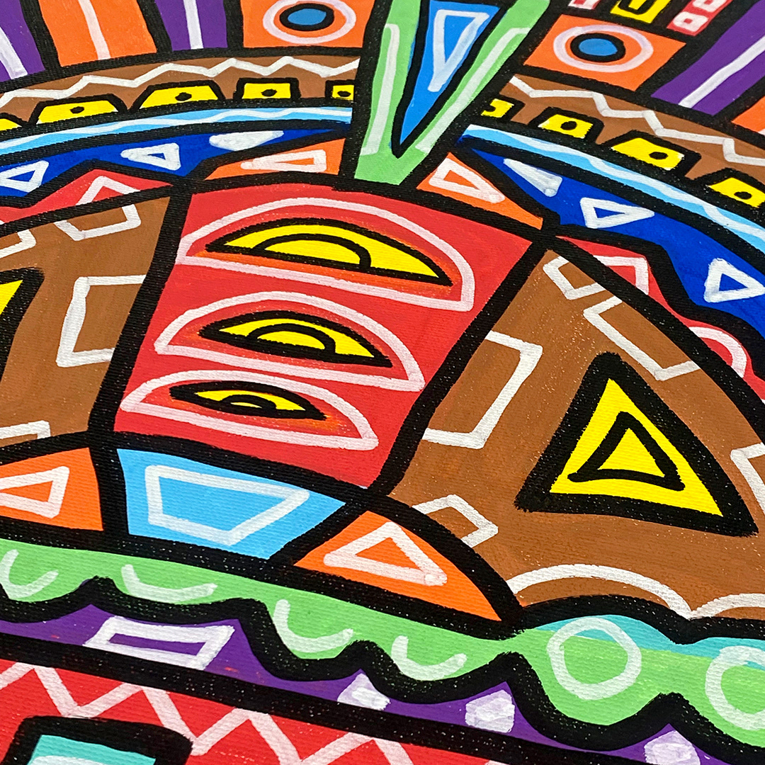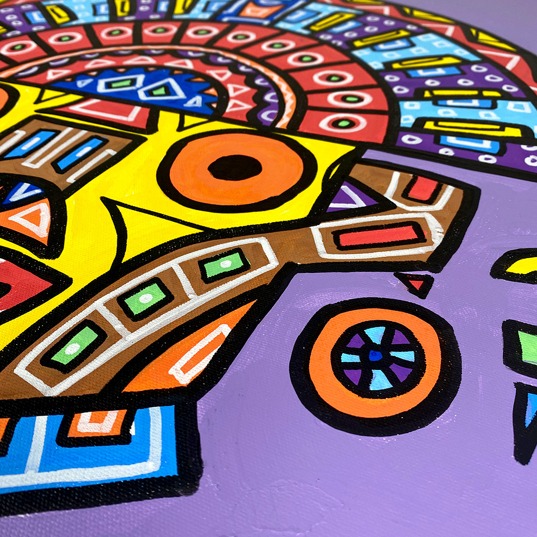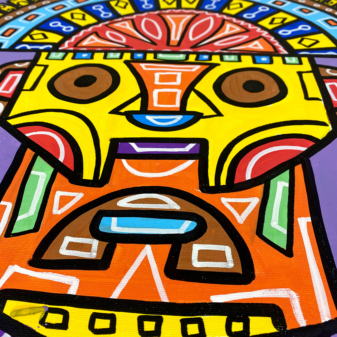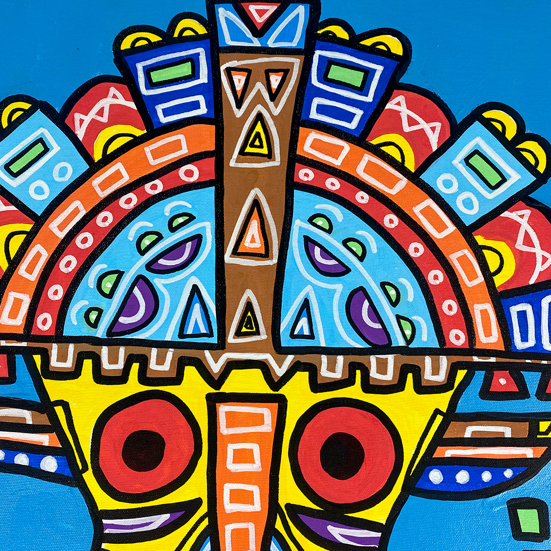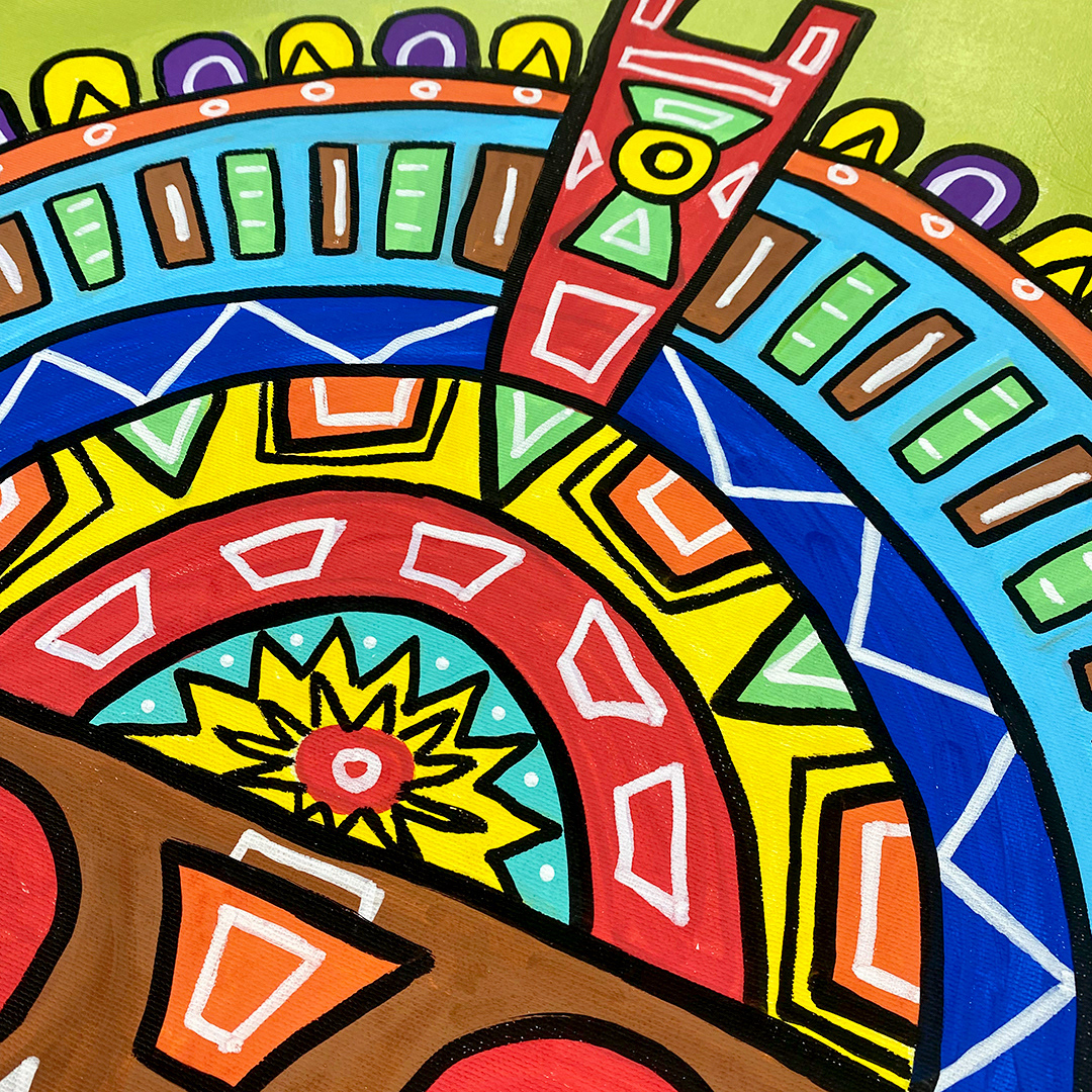 Series: ¡Hola! and ¡Adios! Mural Media: Acrylic and Ink on Canvas Size: 24h x 24w x 1.5d inches Framed Size: 25.5h x 25.5w x 2d inches