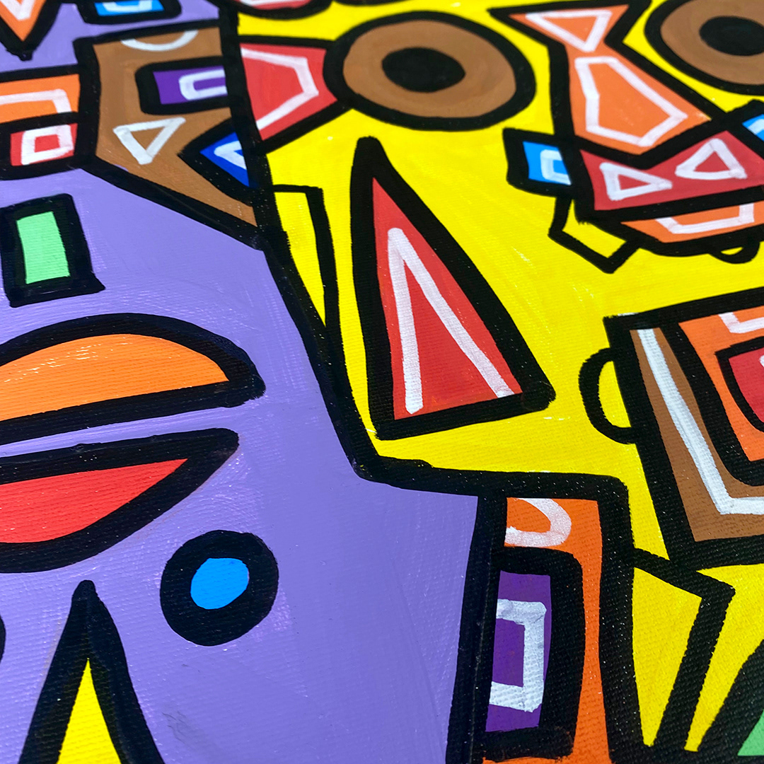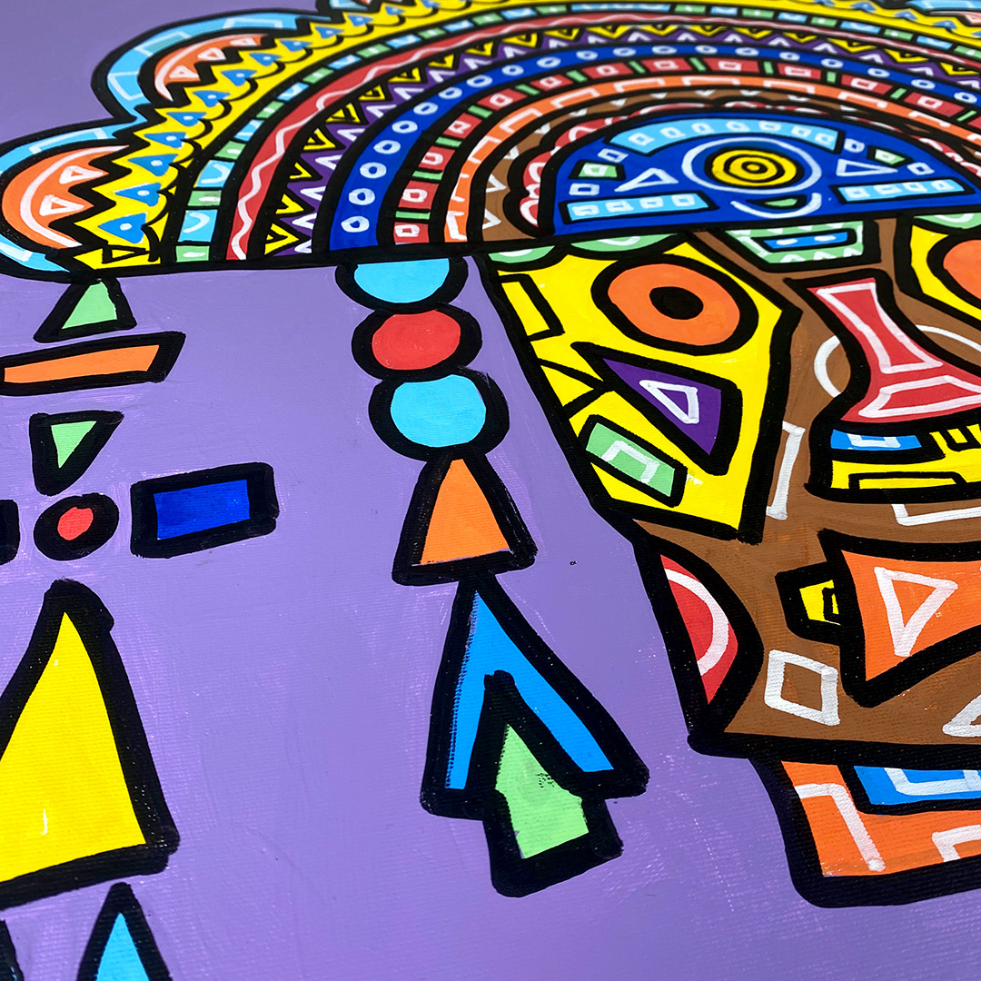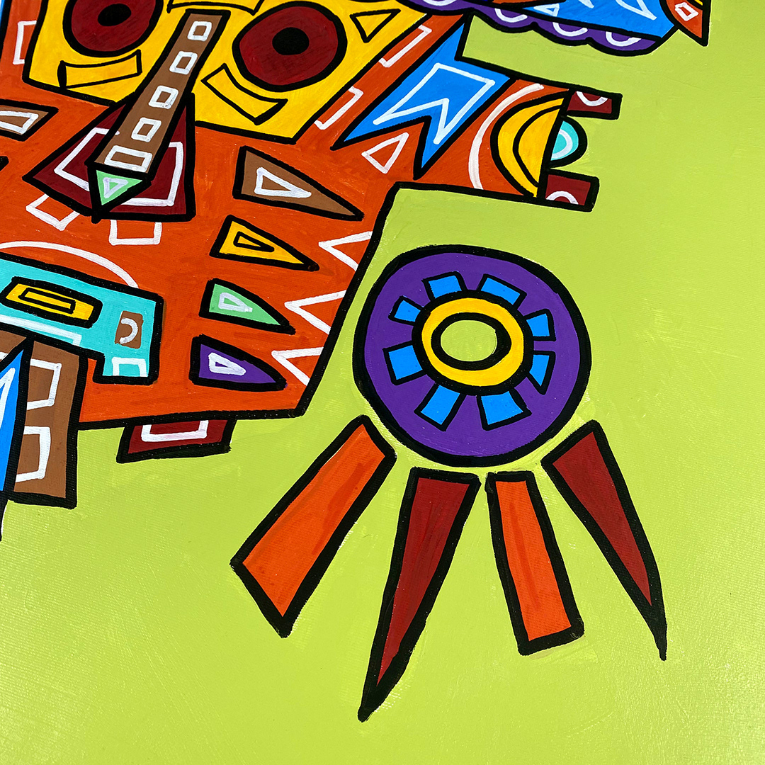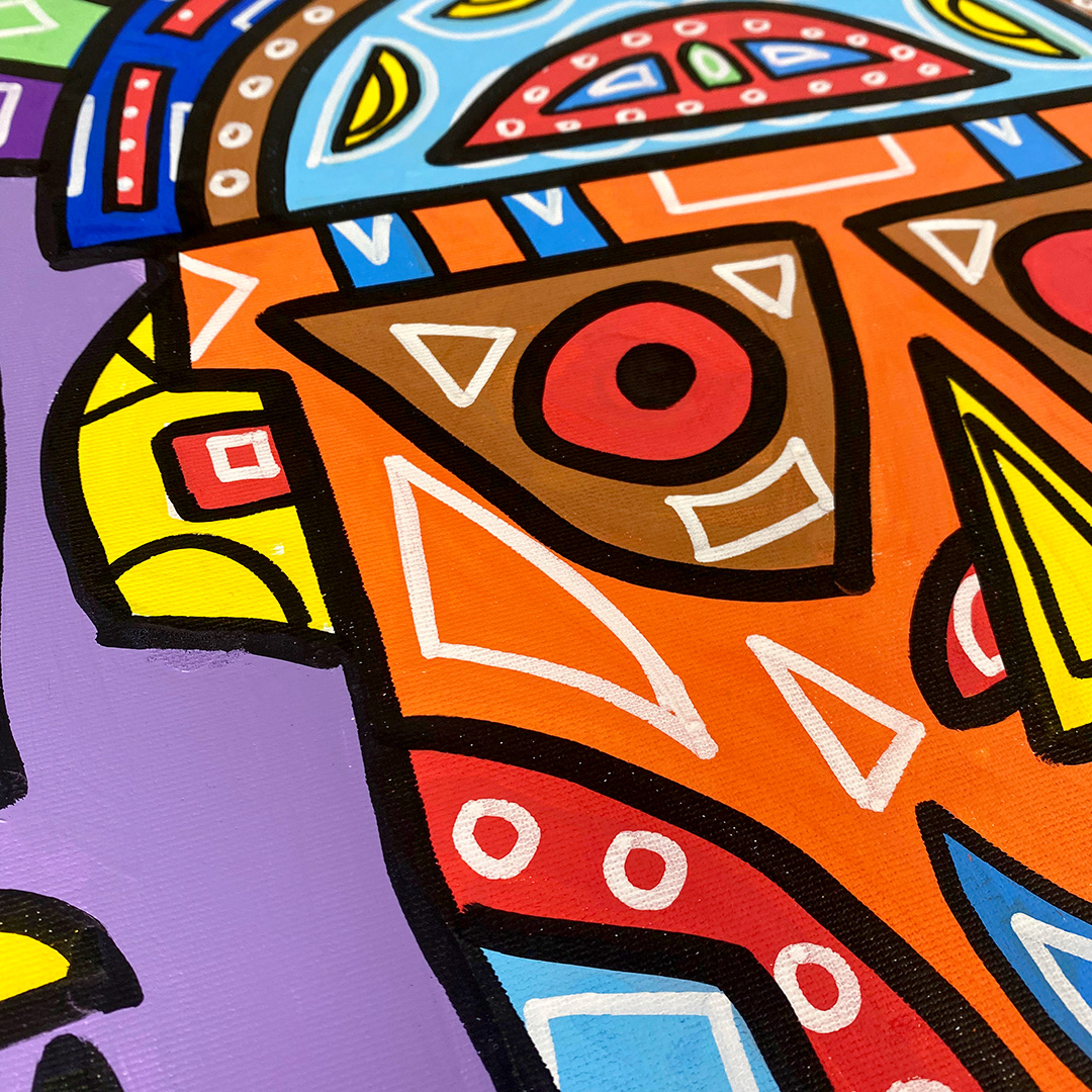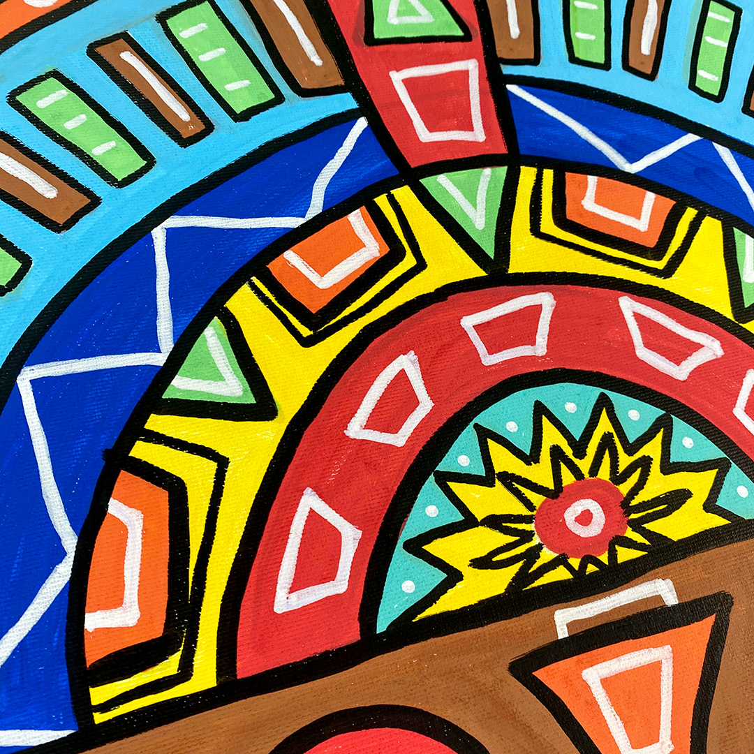 Series: ¡Hola! and ¡Adios! Mural Media: Acrylic and Ink on Canvas Size: 24h x 24w x 1.5d inches Framed Size: 25.5h x 25.5w x 2d inches