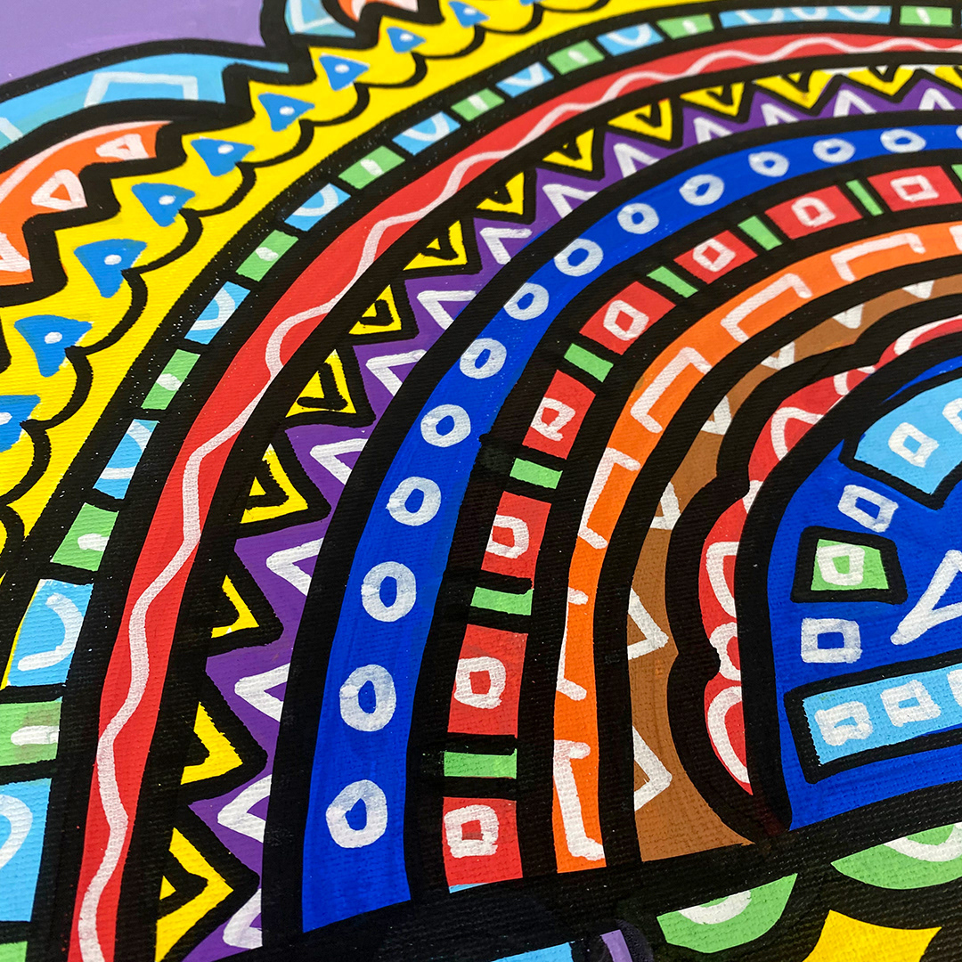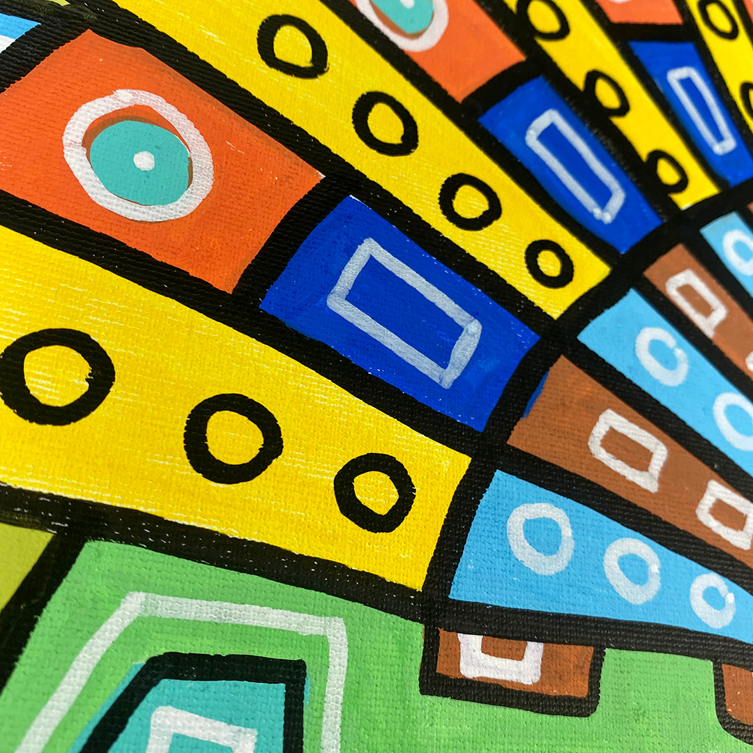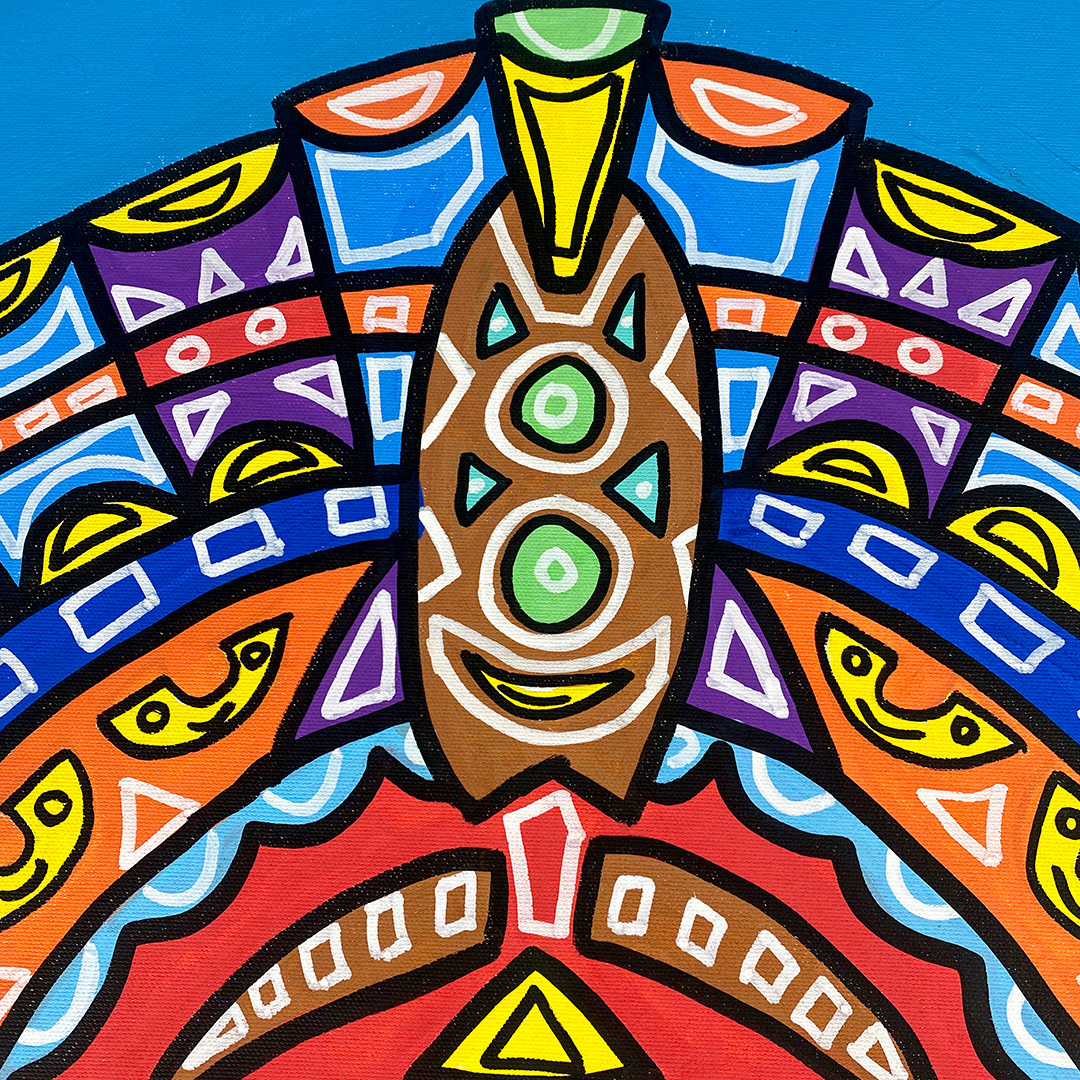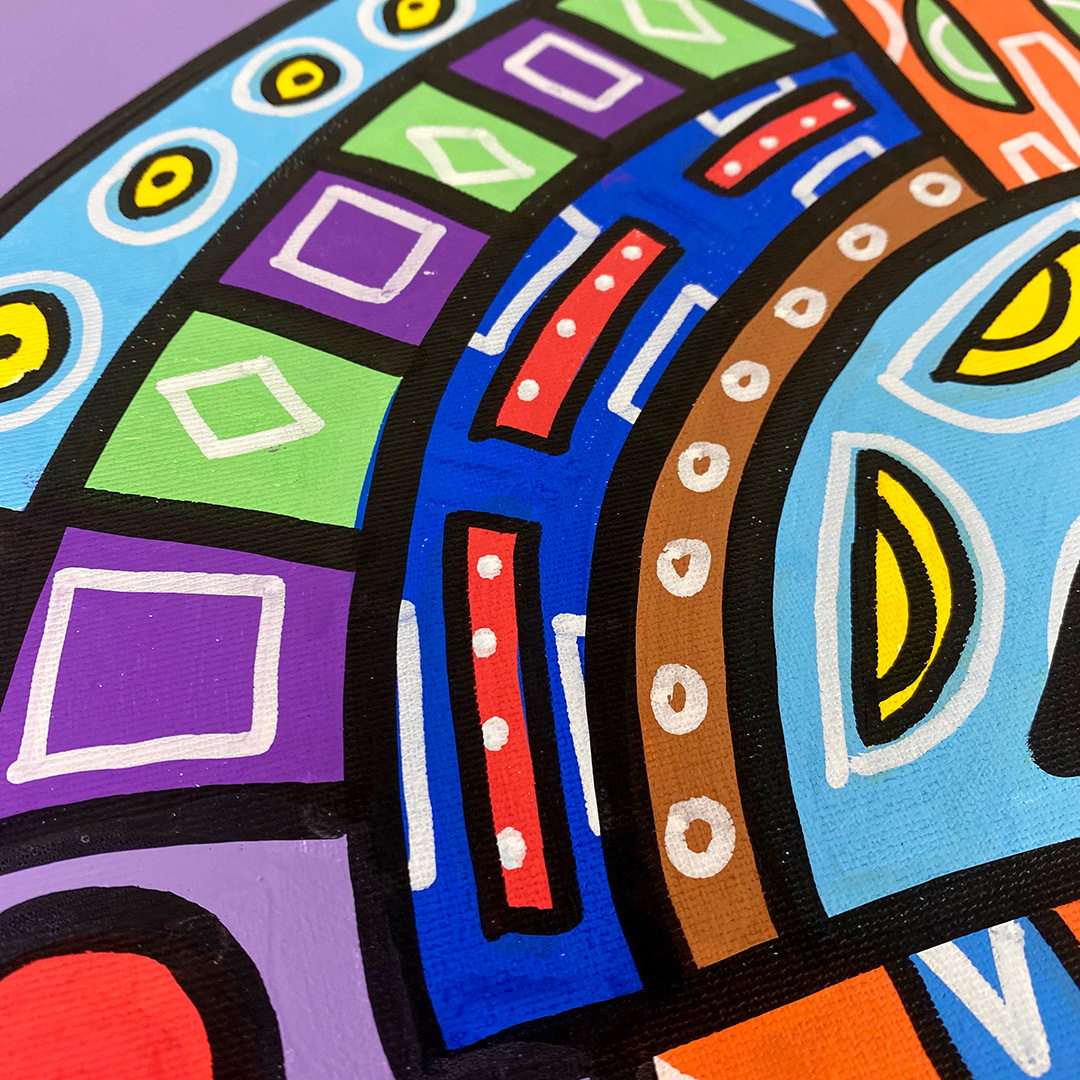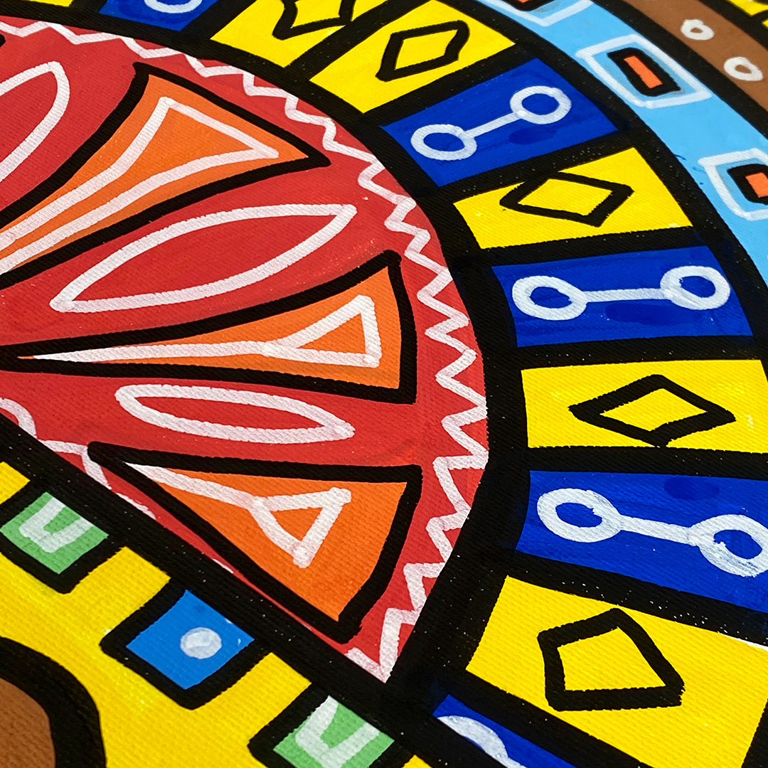 Series: ¡Hola! and ¡Adios! Mural Media: Acrylic and Ink on Canvas Size: 24h x 24w x 1.5d inches Framed Size: 25.5h x 25.5w x 2d inches