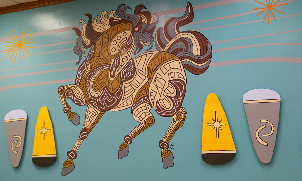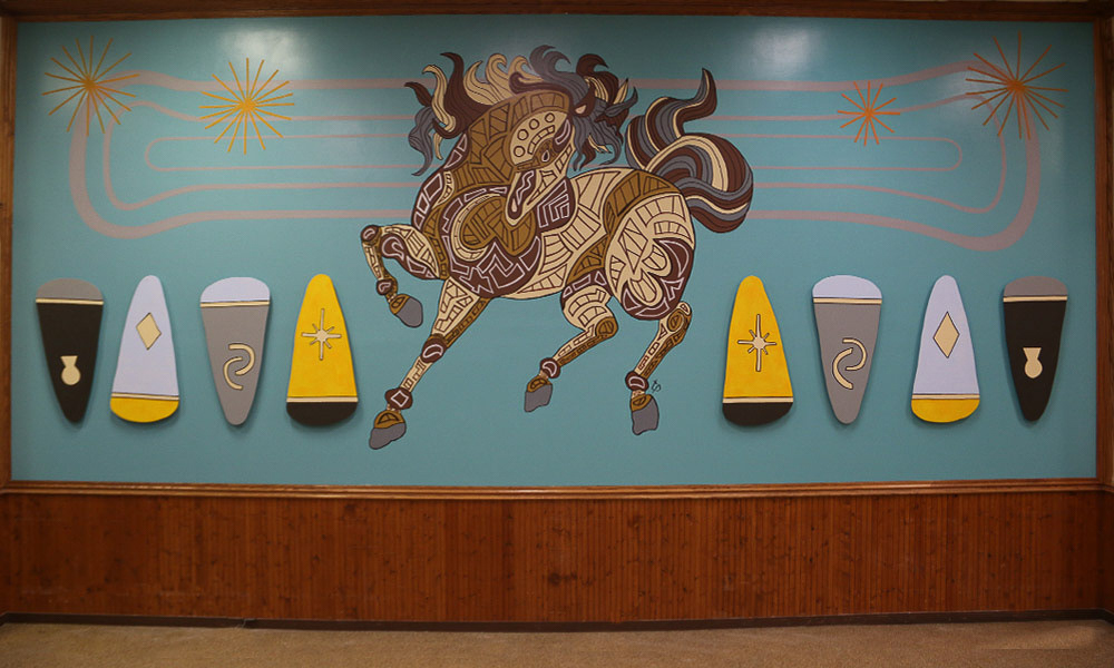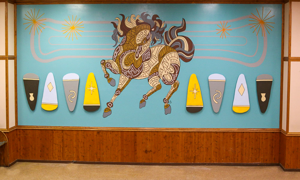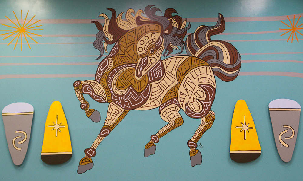 Media: Acrylic on Plaster with Custom Dimensional Wood Cuts Size: 12ft x 29ft (3.6m x 8.8m) The Mane Event Mural is found at the Hawthorne Race Course main concourse located in Cicero, IL