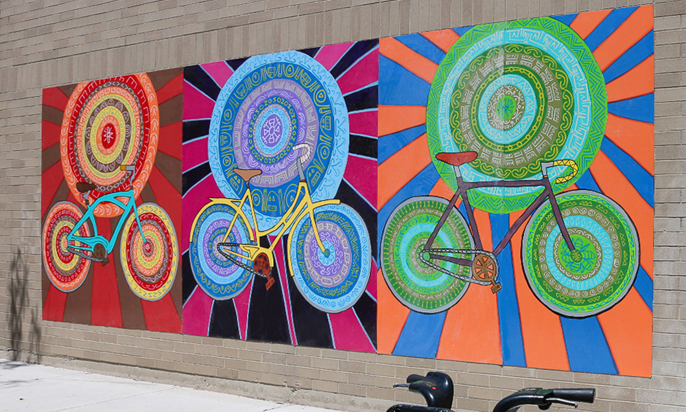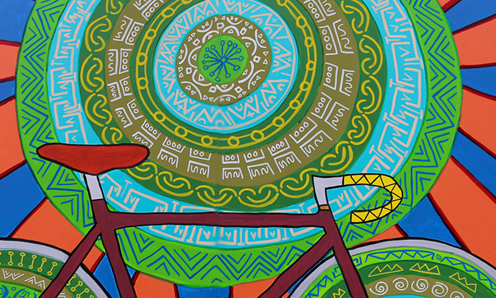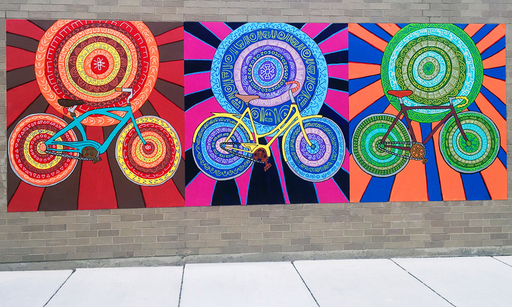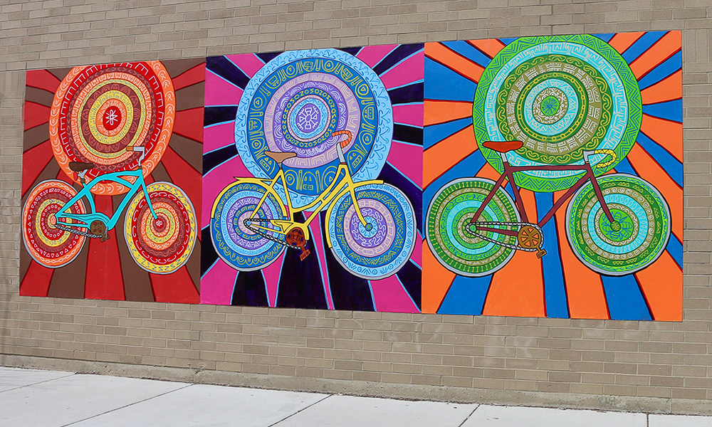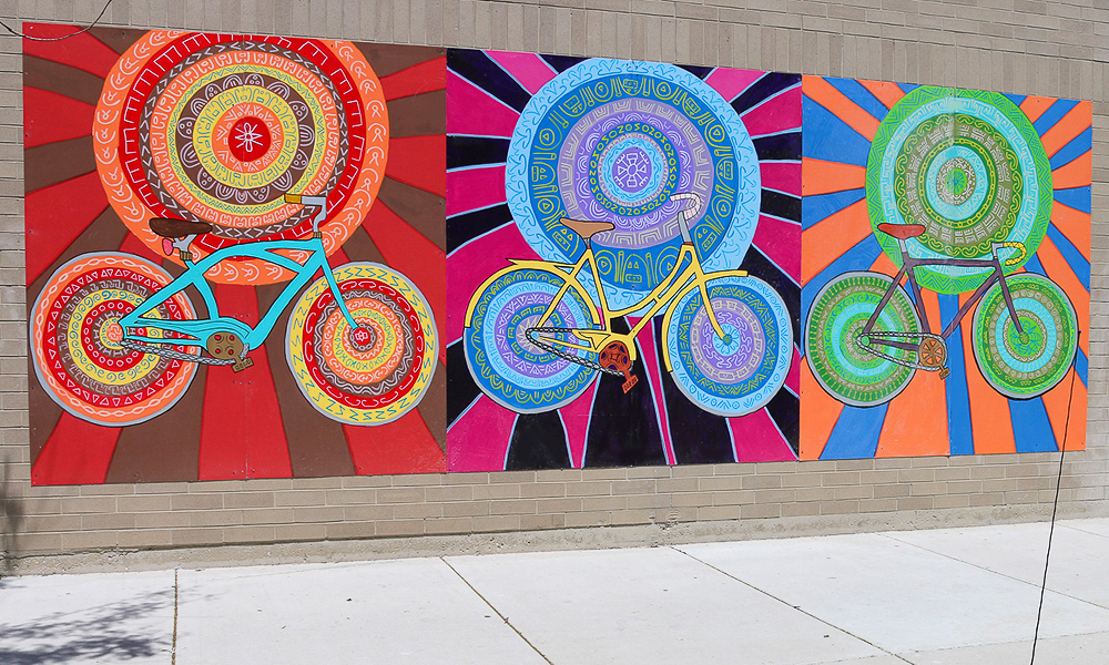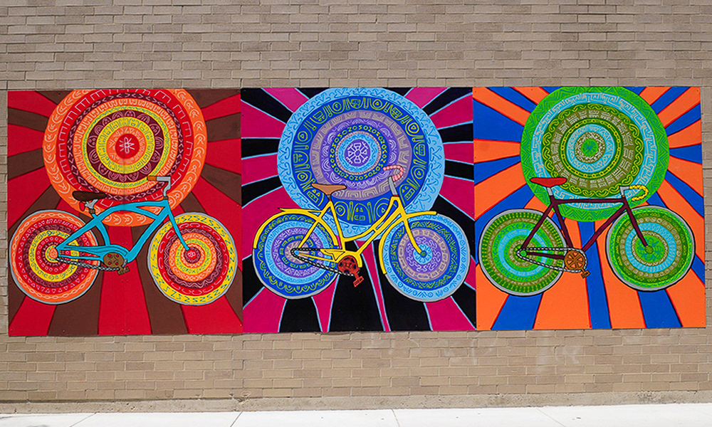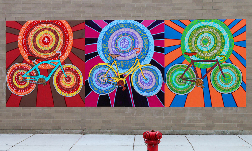 Media: Acrylic and Ink on Dibond Board Size: 8 ft 8 in x 24 ft (2.6 m x 7.3 m) The Spin Cycles Mural is located in Chicago’s 6 Corners Shopping District on the corner of Cuyler and Milwaukee Avenue at the Divy Bike Share station.
