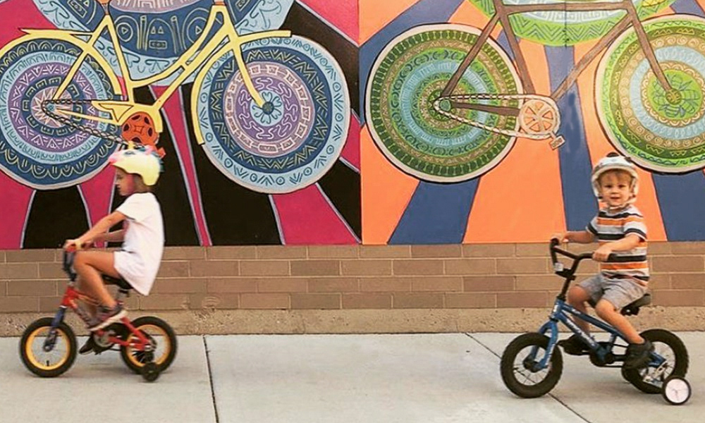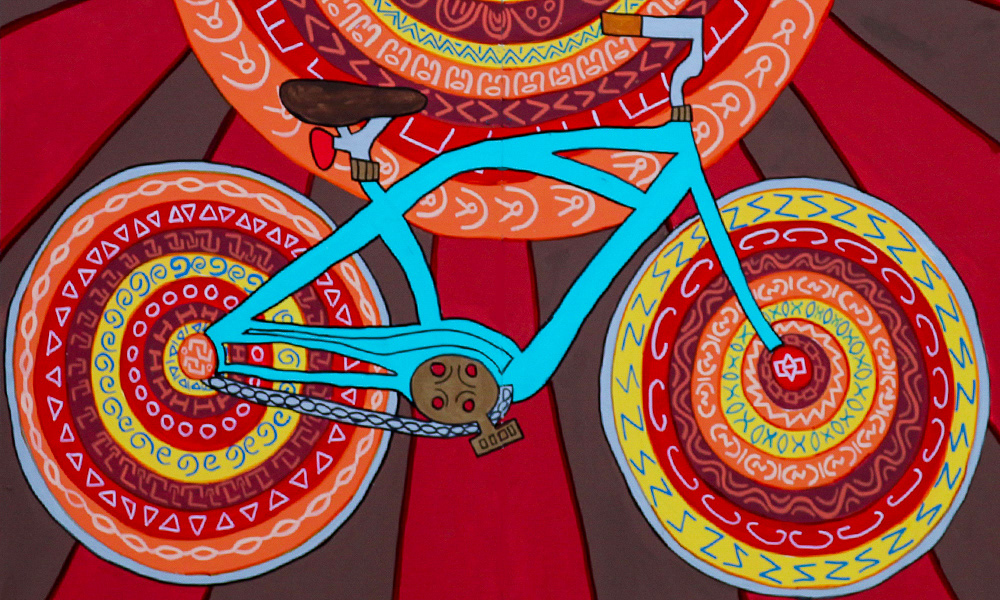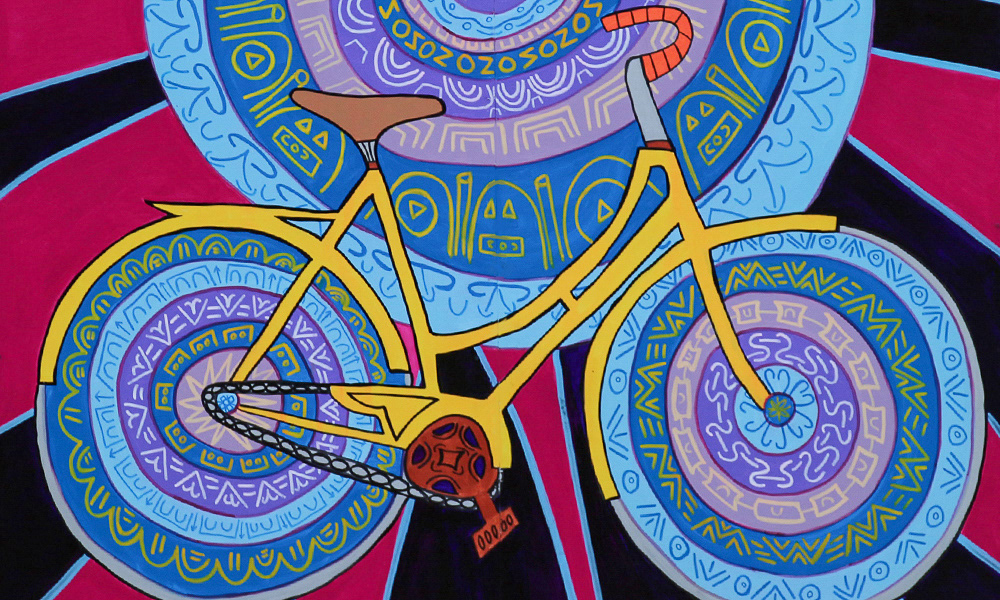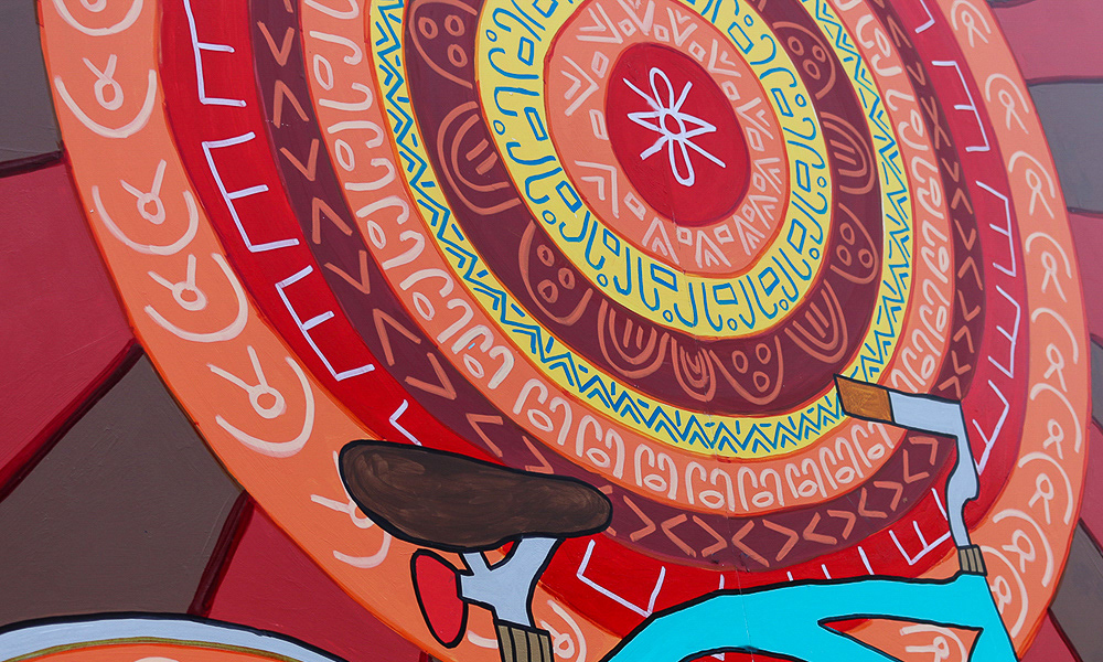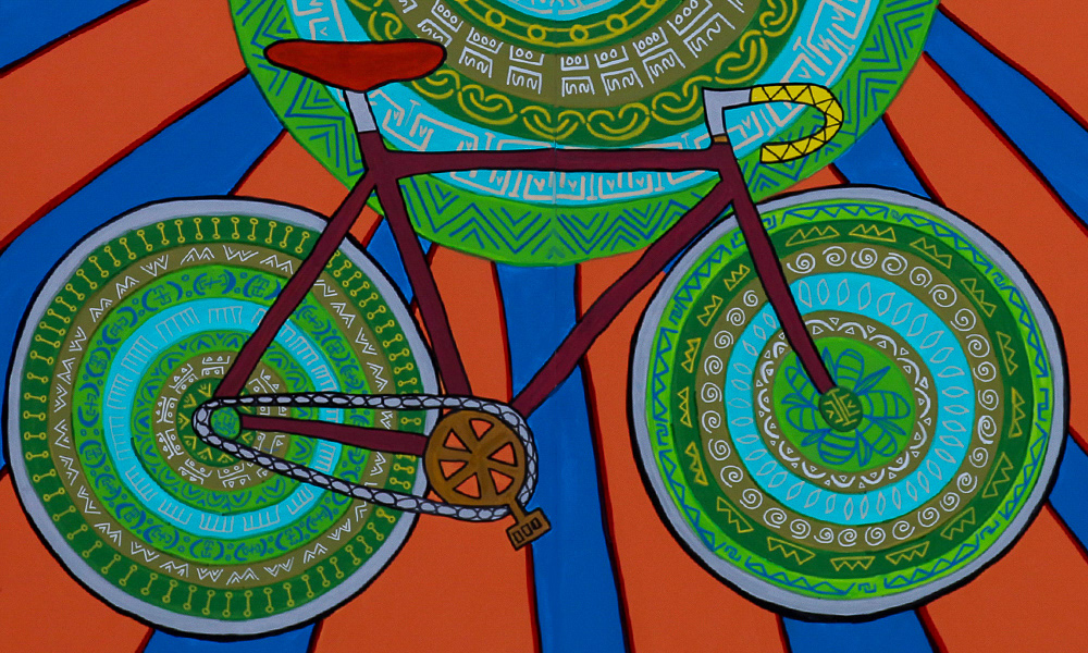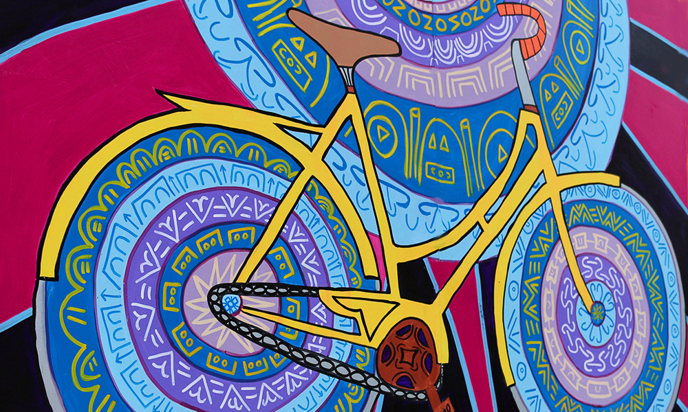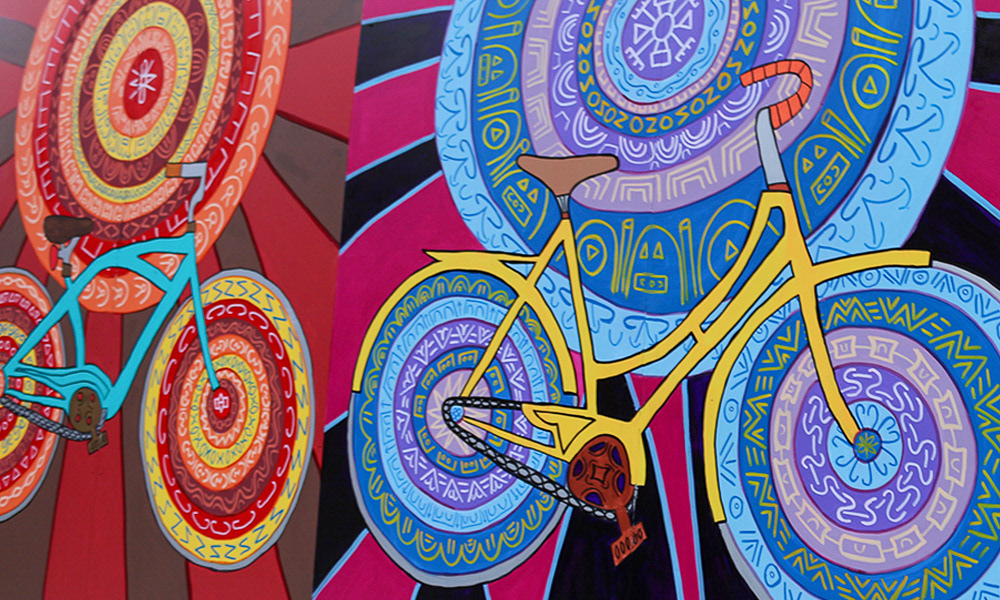 Media: Acrylic and Ink on Dibond Board Size: 8 ft 8 in x 24 ft (2.6 m x 7.3 m) The Spin Cycles Mural is located in Chicago’s 6 Corners Shopping District on the corner of Cuyler and Milwaukee Avenue at the Divy Bike Share station.