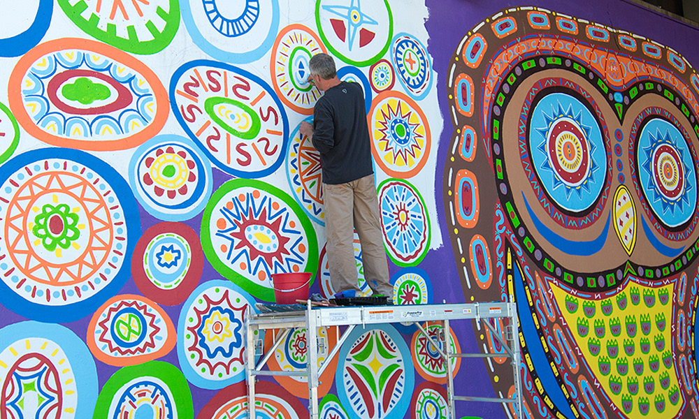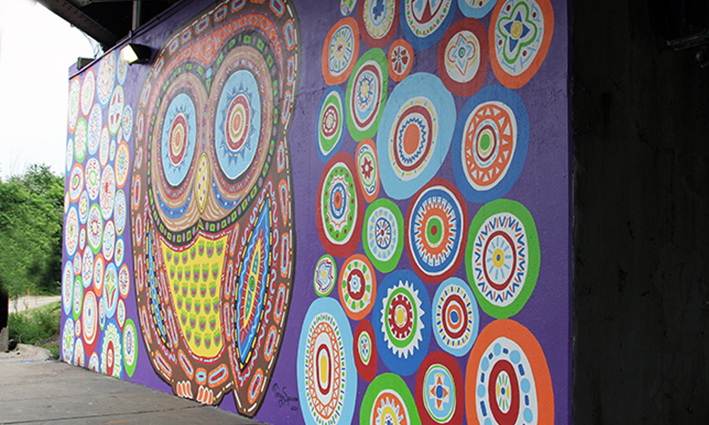 Media: Acrylic on Mason Wall Size: 17 ft x 51 ft (5.2 m x 15.7 m) The Whoot Mural located on Belmont Avenue between the Kennedy Expressway exit ramp and Kedzie Avenue.